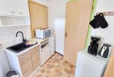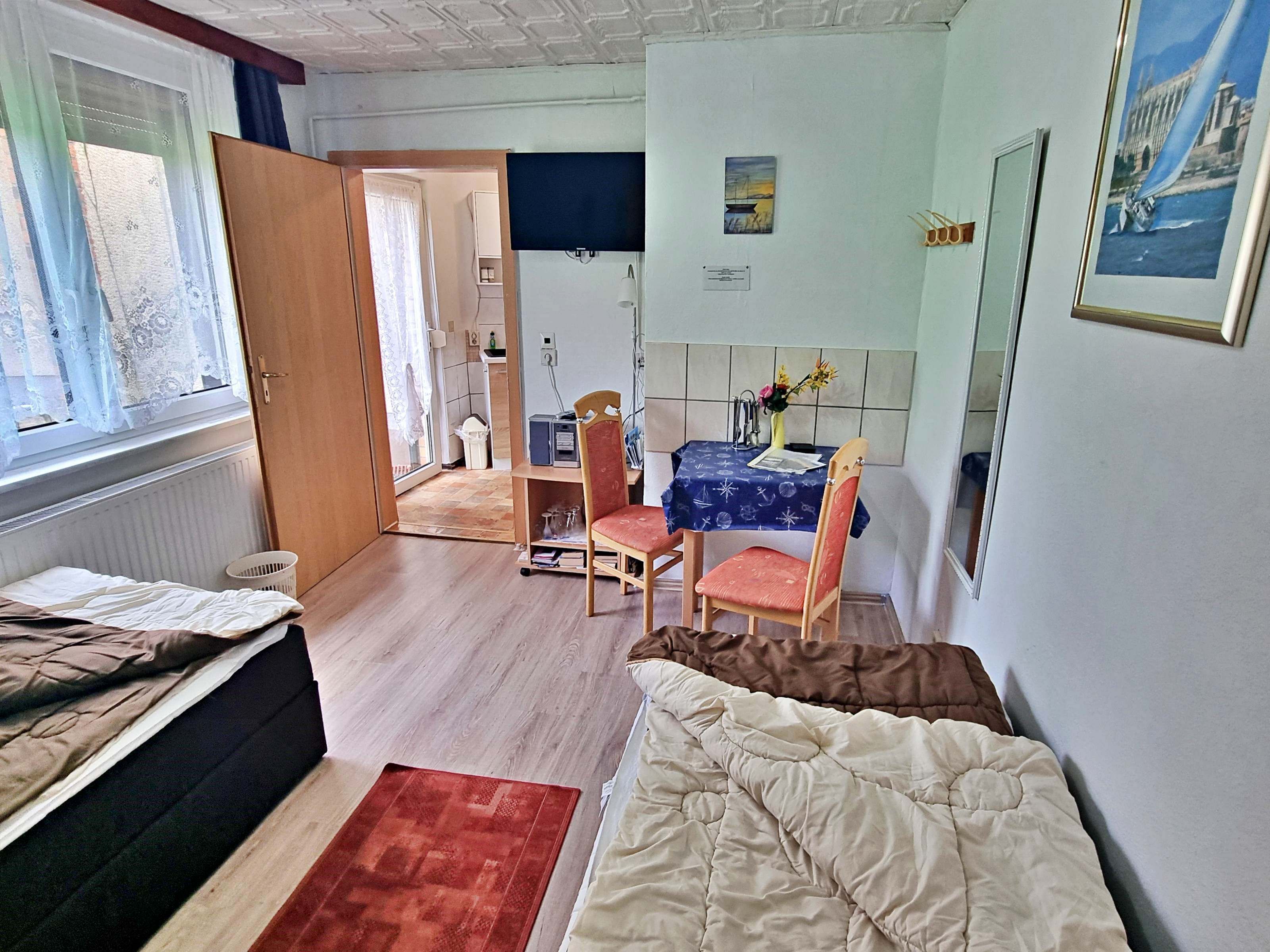 Das ca. 20 qm große freundliche 1-Raum-Appartement verfügt über einen kombinierten Wohn-Schlafraum mit zwei Einzelbetten, Flachbild-TV und einem kleinen Essplatz. Die kleine Küchenzeile ist mit einem Kühlschrank, 2-Platten-Herd, Wasserkocher, Toaster und Kaffeemaschine ausgestattet – alles da, was man braucht für das gemütliche Frühstück oder das kleine Abendessen zu zweit. Das Tageslicht-Badezimmer hat eine ebenerdige Dusche und WC. Auf der angrenzenden möblierten Terrasse können Sie bei schönem Wetter schon morgens Ihren Kaffee genießen oder den Abend bei einem Glas Wein ausklingen lassen. WLAN steht Ihnen während des gesamten Urlaubs zur Verfügung. Ihren Pkw können Sie direkt an der Unterkunft parken und Ihre Fahrräder können Sie gern im Abstellraum sicher unterstellen.