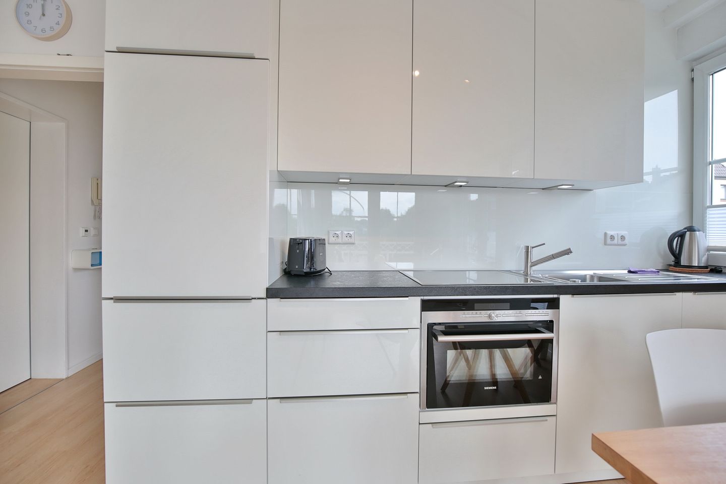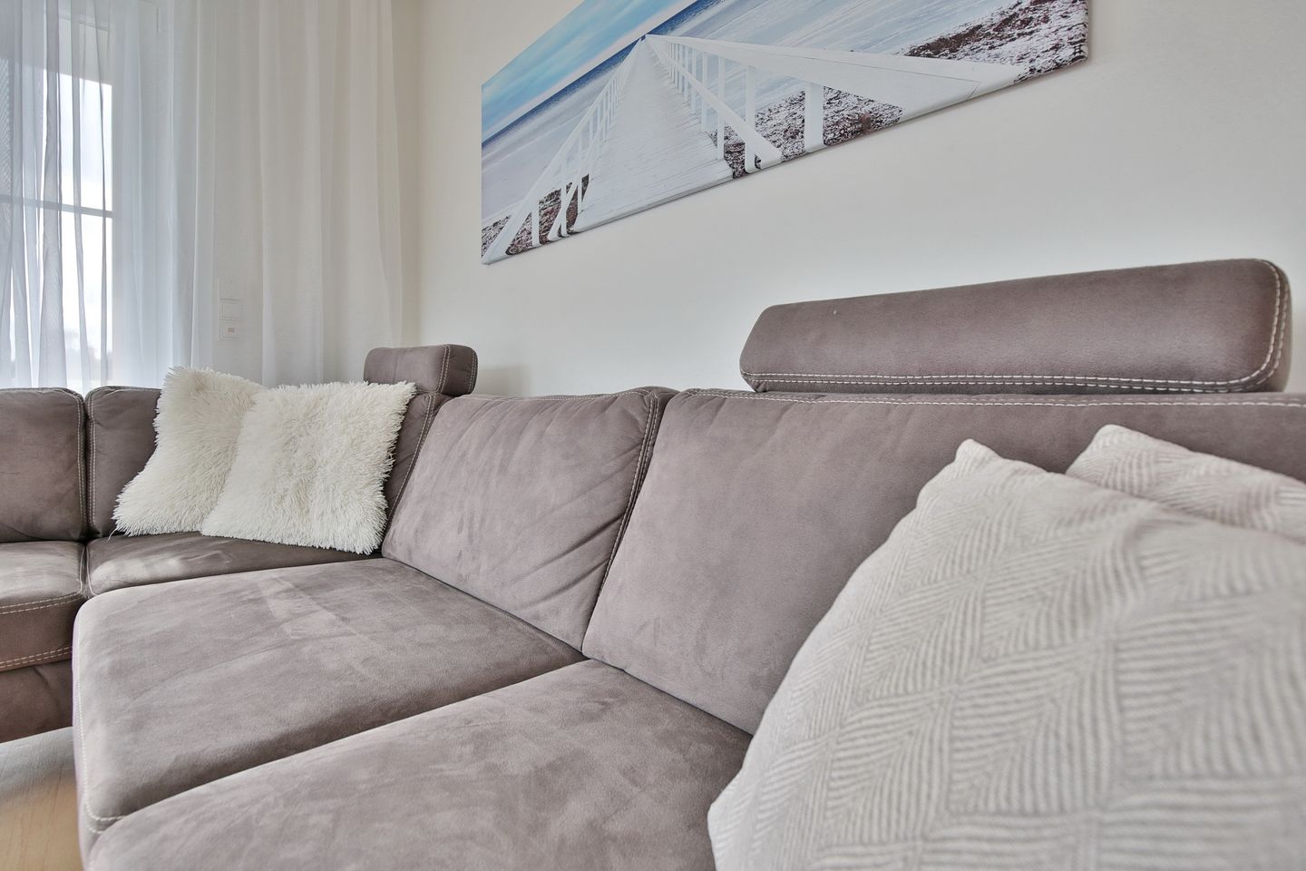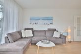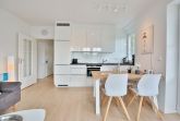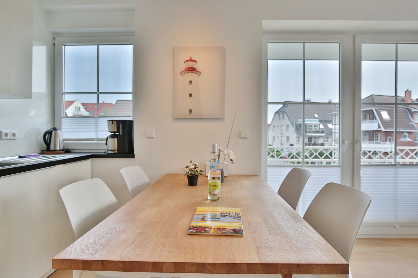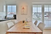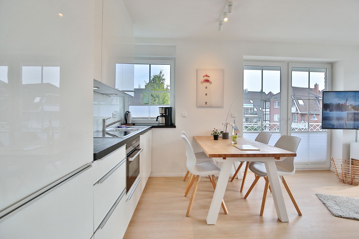 Die moderne Einrichtung besticht bereits im Wohnzimmer mit einem gemütlichen Ecksofa und einem großen Flatscreen-TV. Sie genießen die hervorragende Aussicht vom Wohnzimmer und dem großen Eckbalkon in Richtung Osten sowie Richtung Süden. Die im Wohnraum integrierte Küchenzeile lässt keine Wünsche vom Frühstück bis Abendbrot offen. Neben dem Ceranfeld-Herd und Kühlschrank mit Gefrierfach gibt es selbstverständlich auch einen Backofen, eine Kaffeemaschine, Toaster und eine Spülmaschine. Der gemütliche Esstisch rundet den Komfort ab.