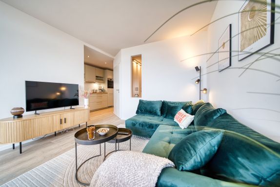 • Wohnbereich: Der ansprechende Wohnbereich ist mit einem komfortablen Sofa und einem Smart-TV ausgestattet. Hier können Sie nach einem aktiven Tag an der Ostsee entspannen.