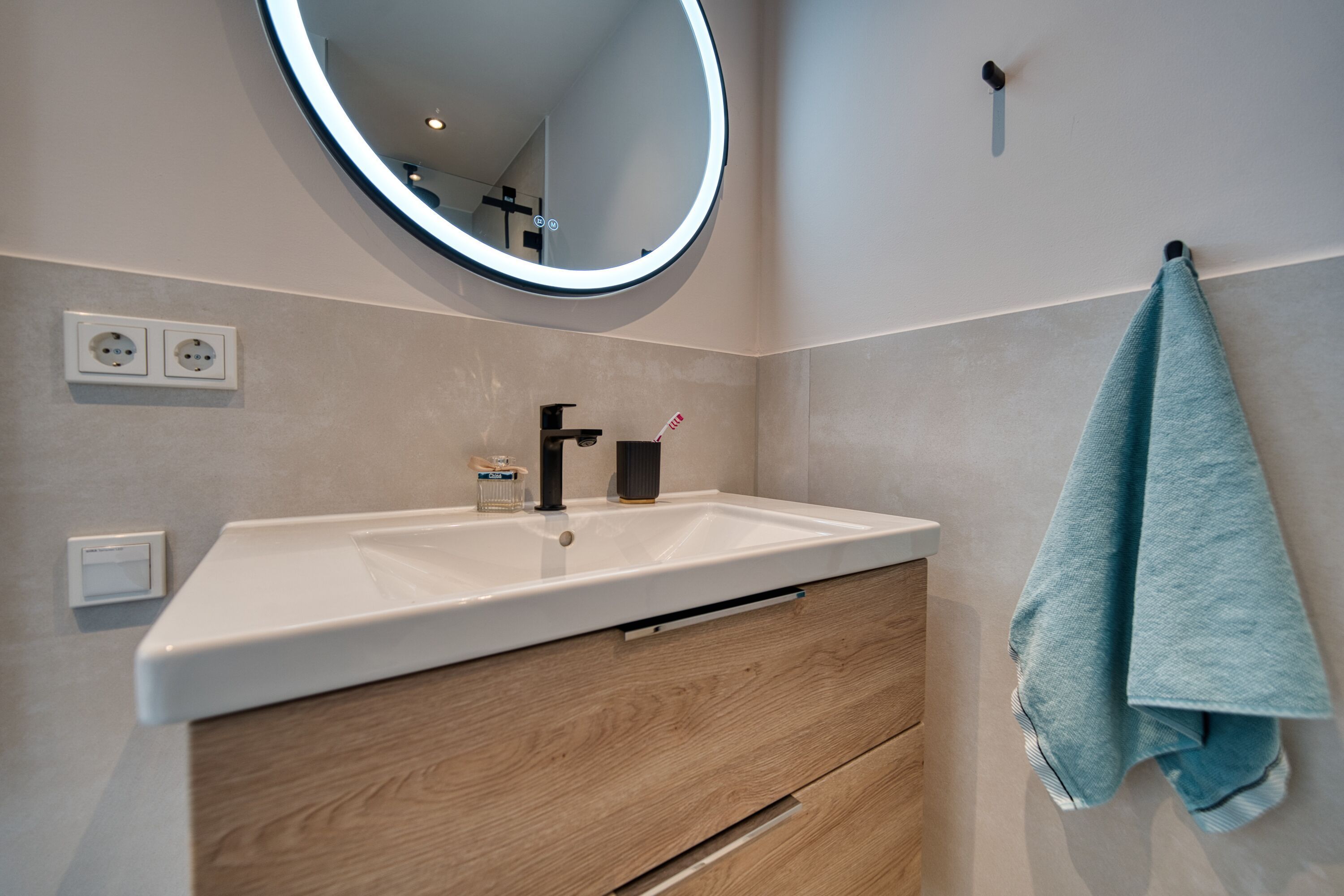 • Bad: Das moderne Bad ist mit einer ebenerdigen Dusche ausgestattet komfortabel für alle Altersgruppen.