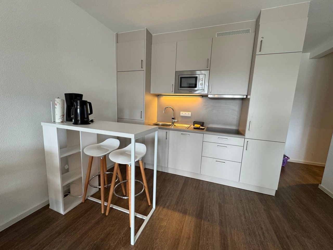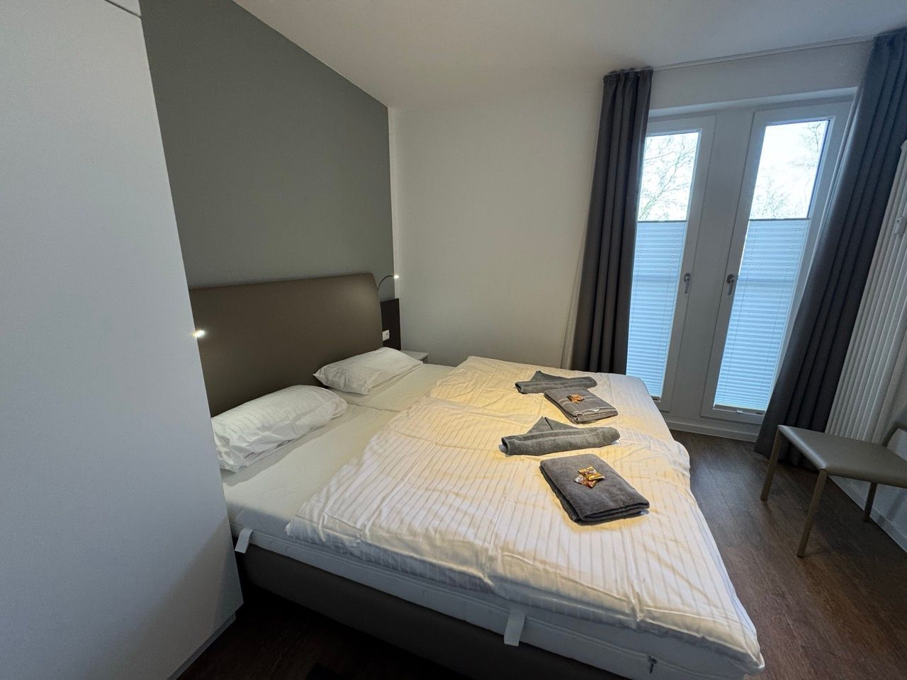 Große Fenster sorgen für viel Tageslicht. Die Möblierung ist schlicht, modern und funktional ideal für Gäste, die eine gepflegte und aufgeräumte Atmosphäre schätzen.