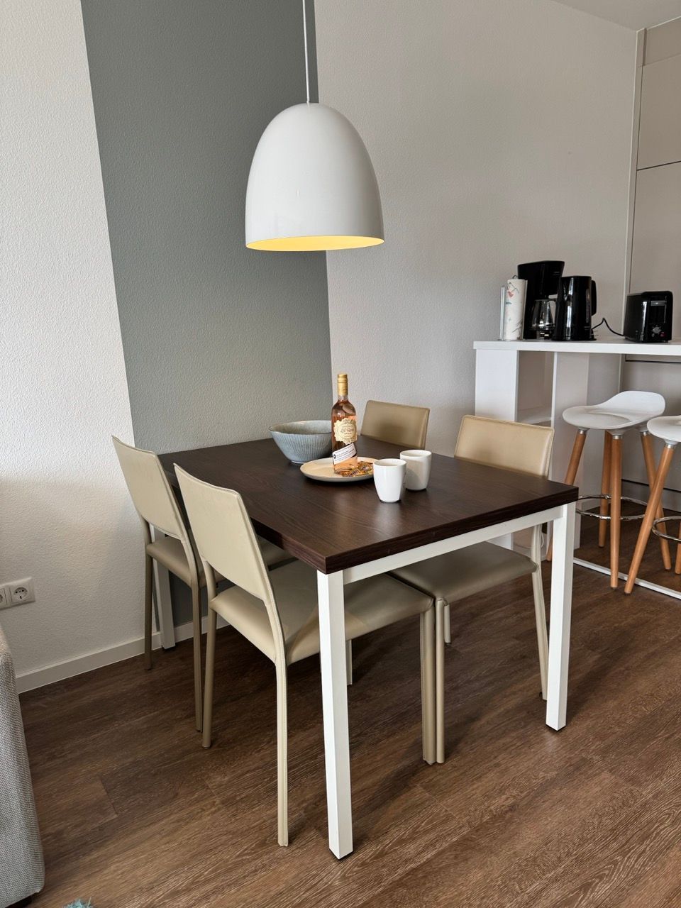 Der Esstisch ist geräumig und bietet Platz für vier Personen perfekt für gemeinsame Mahlzeiten, Spieleabende oder ein gemütliches Frühstück am Morgen.
