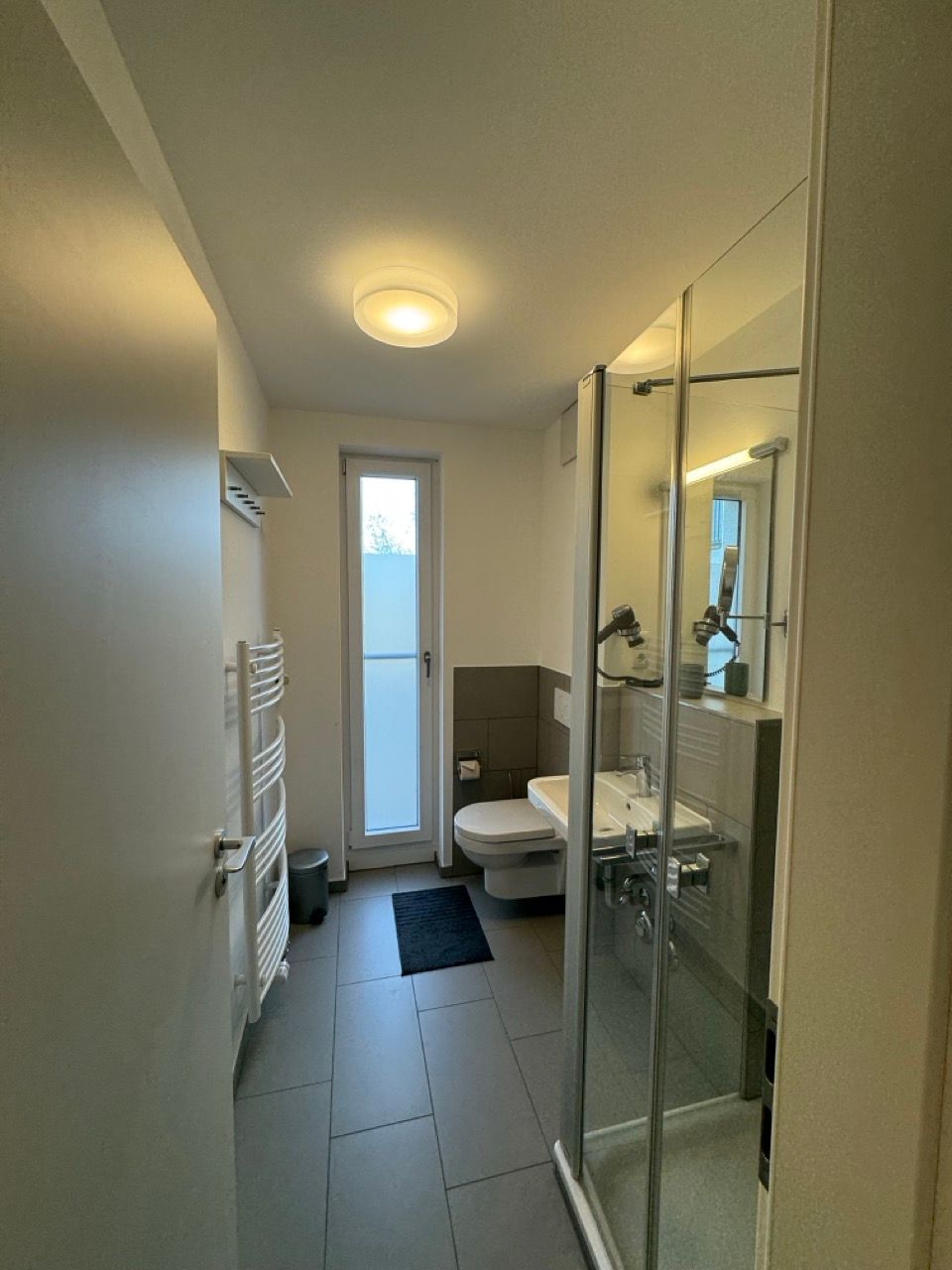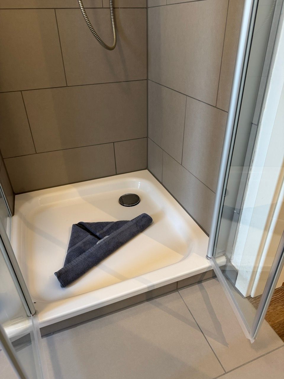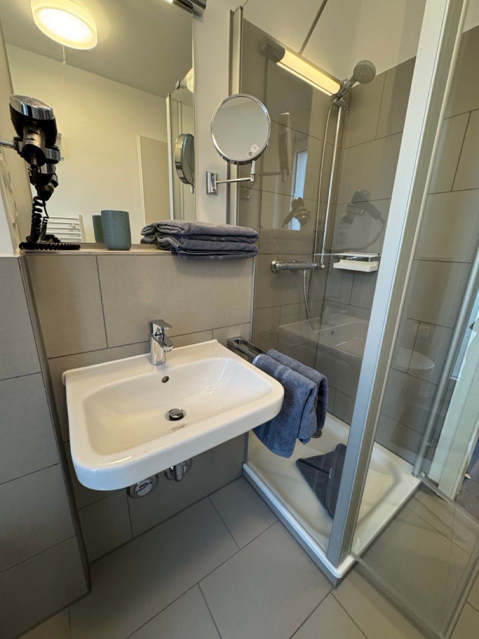 Badezimmer Funktional, modern und gepflegtDas Badezimmer ist mit einer großen Dusche, einem Waschbecken mit Spiegel, einem Föhn und ausreichend Ablagemöglichkeiten ausgestattet. Die Gestaltung ist hell und freundlich, die Ausstattung modern und praktisch.