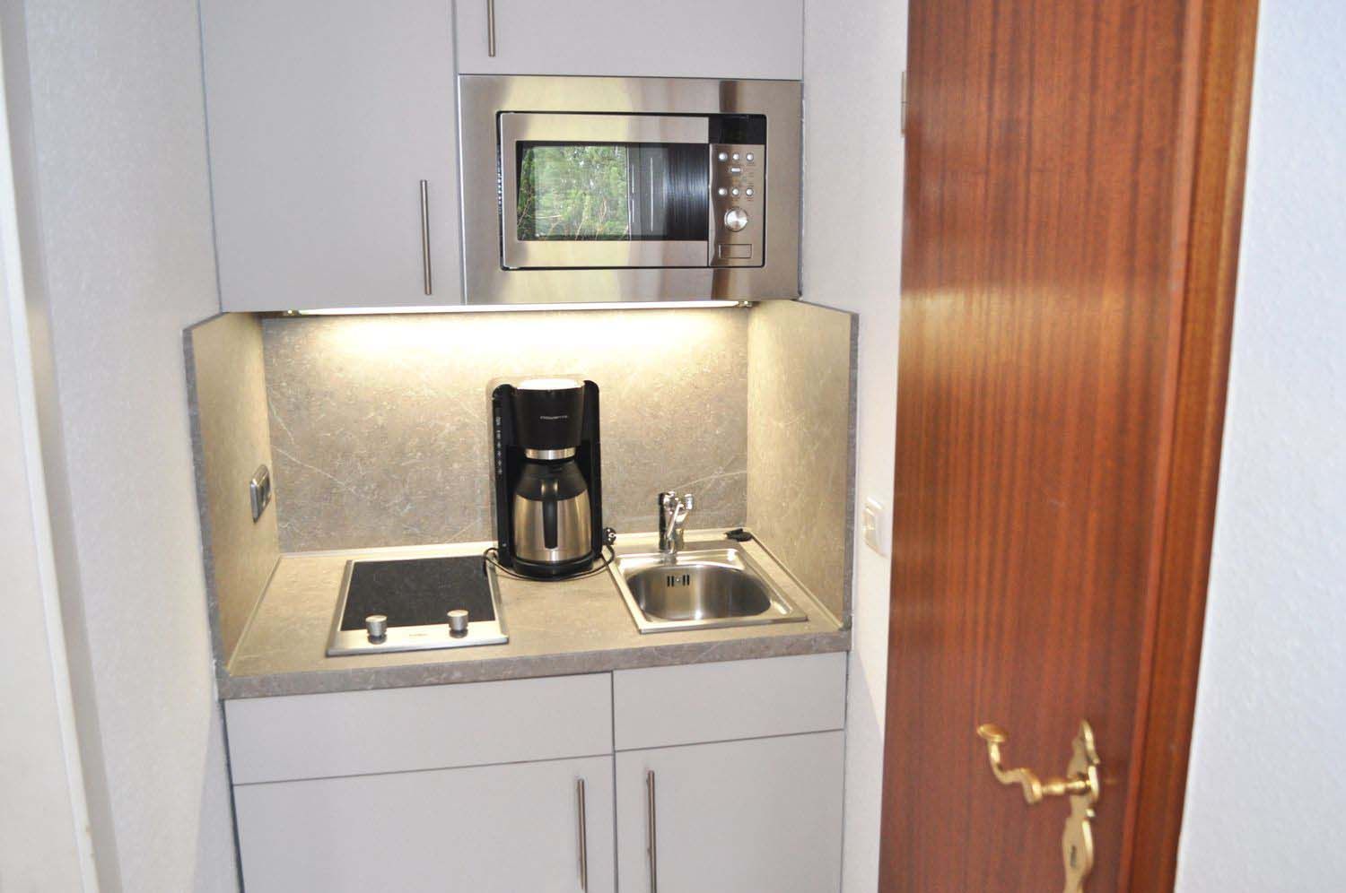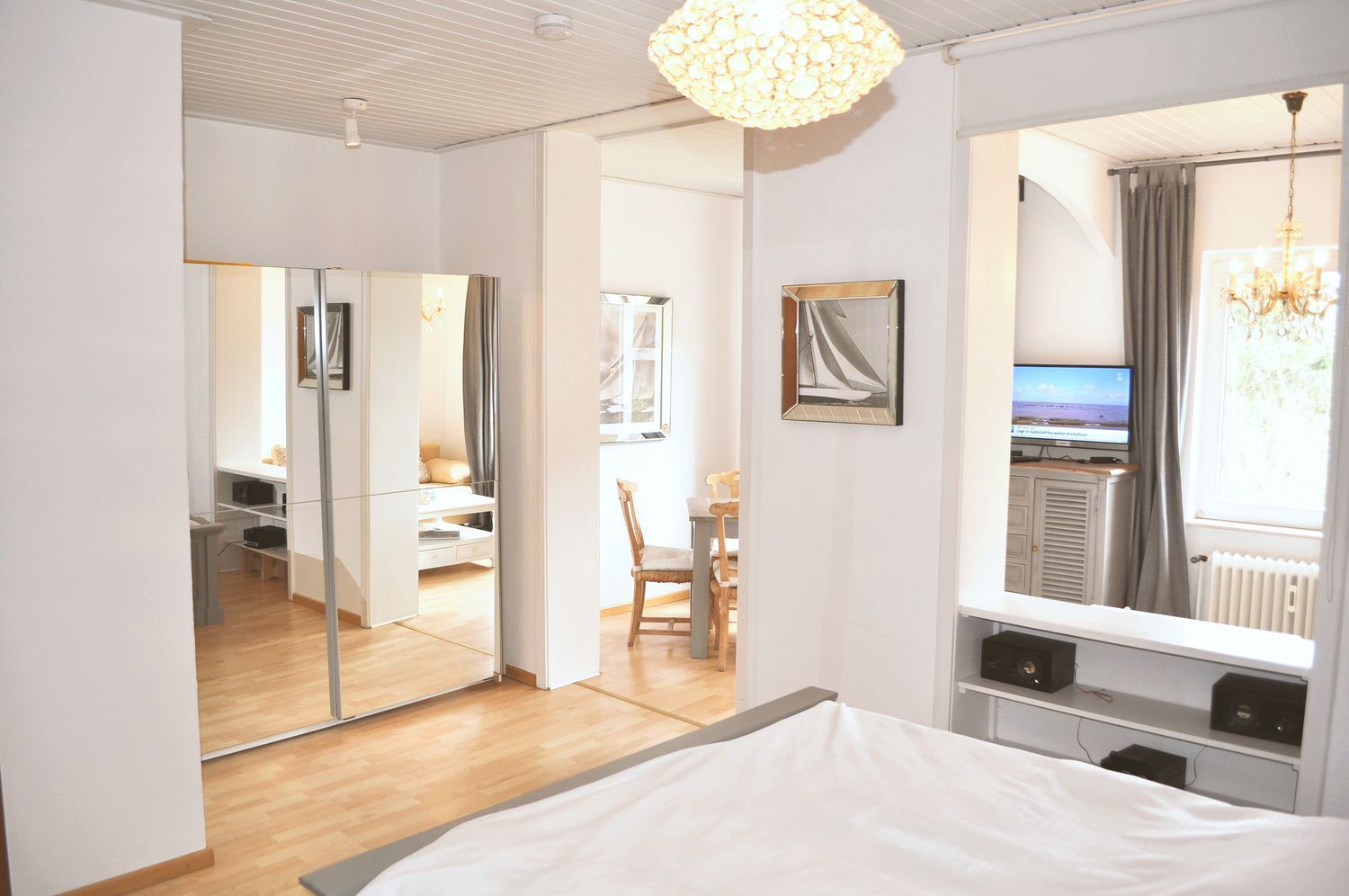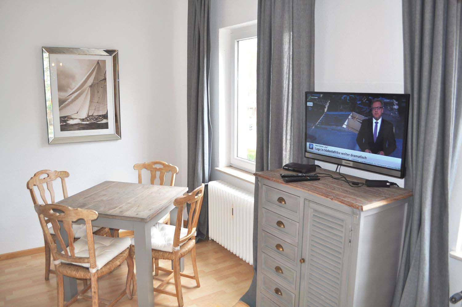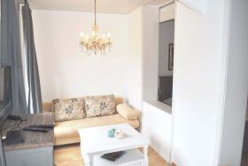 Wohnzimmer: 2 Kommoden, 2 Leselampen, 2 Nachttische, 2 Plattenherd, 4 Stühle, Couchtisch, Doppelbett 2,00 x 1,60 m, DVBT-TV, Esstisch, Flachbildschirm, Garderobe, Geschirr, Kaffeemaschine, Kleiderschrank, Kochtöpfe, Küchenzeile, Kühlschrank mit 3* Gefrierfach, Mikrowelle, Schlafcouch 1,42 x 1,97 m, Stereoanlage mit CD-Player und USB-Anschluss, Toaster, Wasserkocher