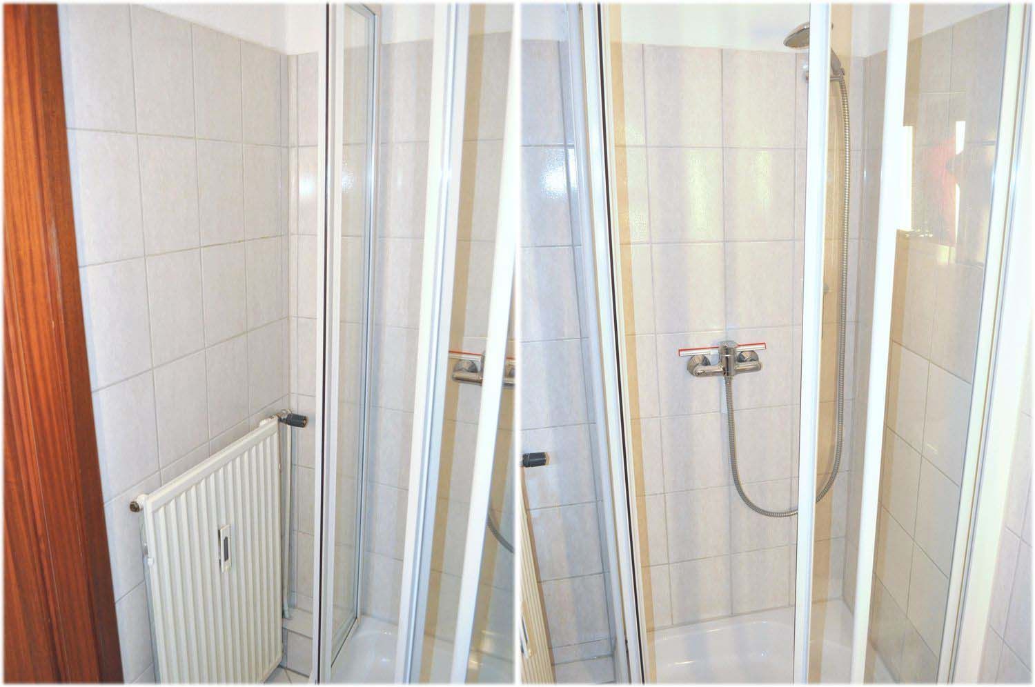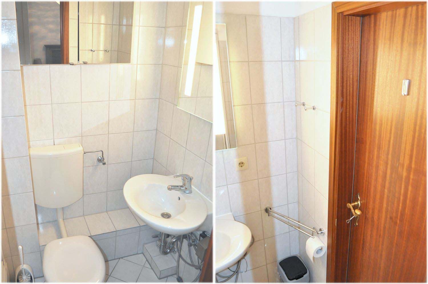 Bad 1: Dusche, Duschkabine, Hängeschrank, Spiegel, Waschbecken, WC