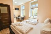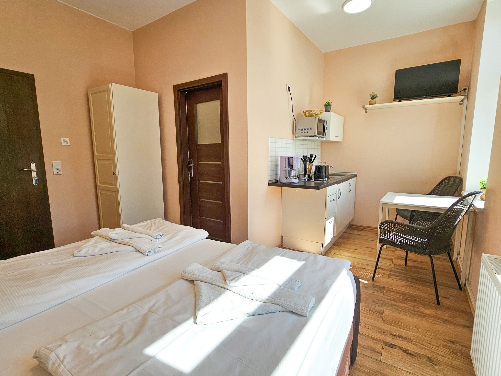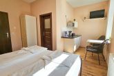 Das gemütlich eingerichtete Appartement verfügt über einen Wohn-/ Schlafbereich mit einem Doppelbett, eine Sitzgelegenheit mit einer kleinen Pantry-Küche.