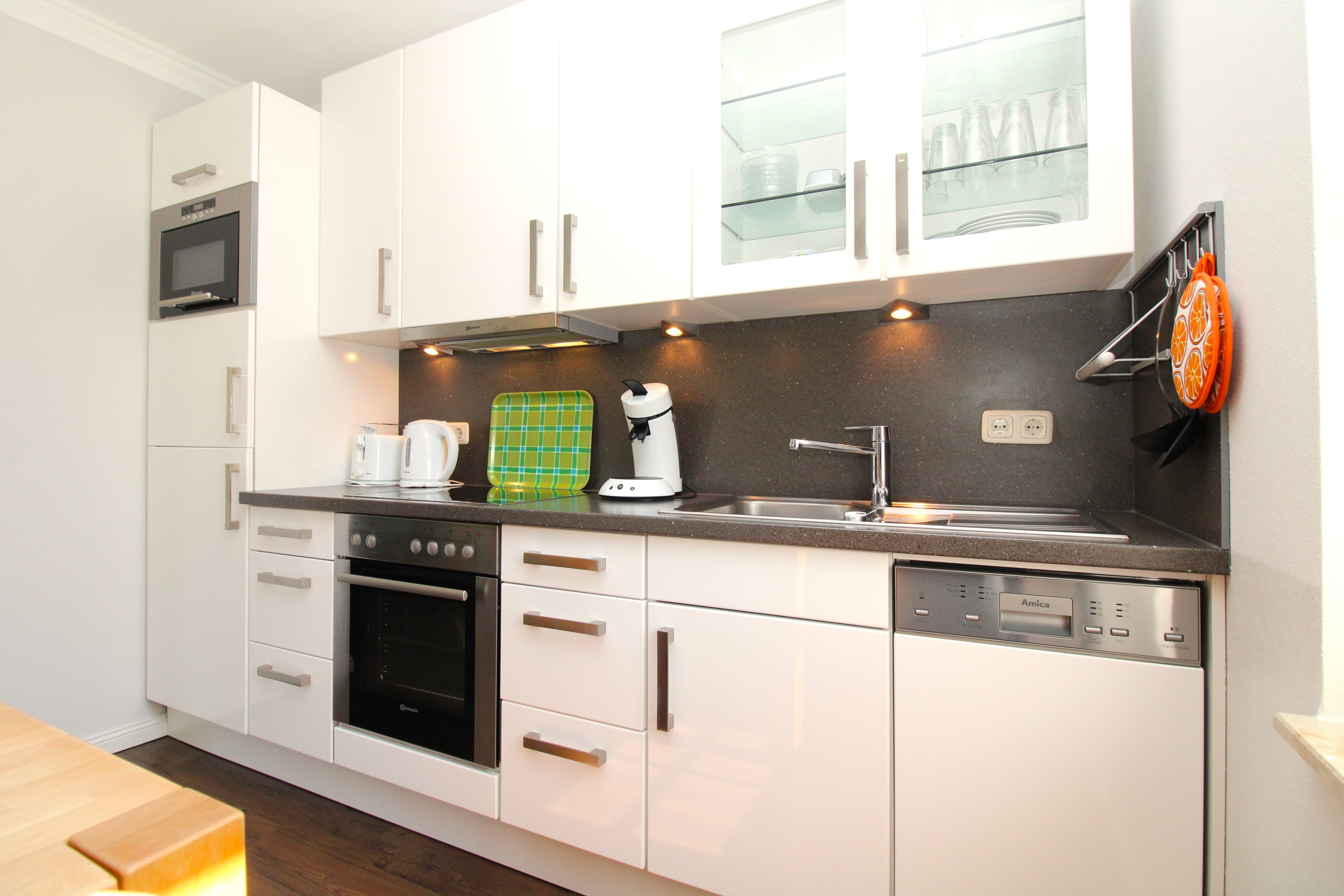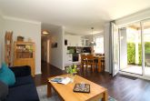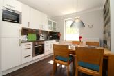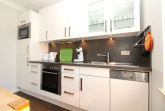 Das Wohnzimmer wird durch bodentiefe Fenstertüren lichtdurchflutet und bietet direkten Zugang zur großzügigen Terrasse mit Südost- Ausrichtung. Die angeschlossene und offene Einbauküche ist komplett ausgestattet mit Backofen, Ceranfeld, Wasserkocher, Toaster, Kaffeemaschine, Pad-Maschine, Kühlschrank mit Gefrierfach und einer Mikrowelle.