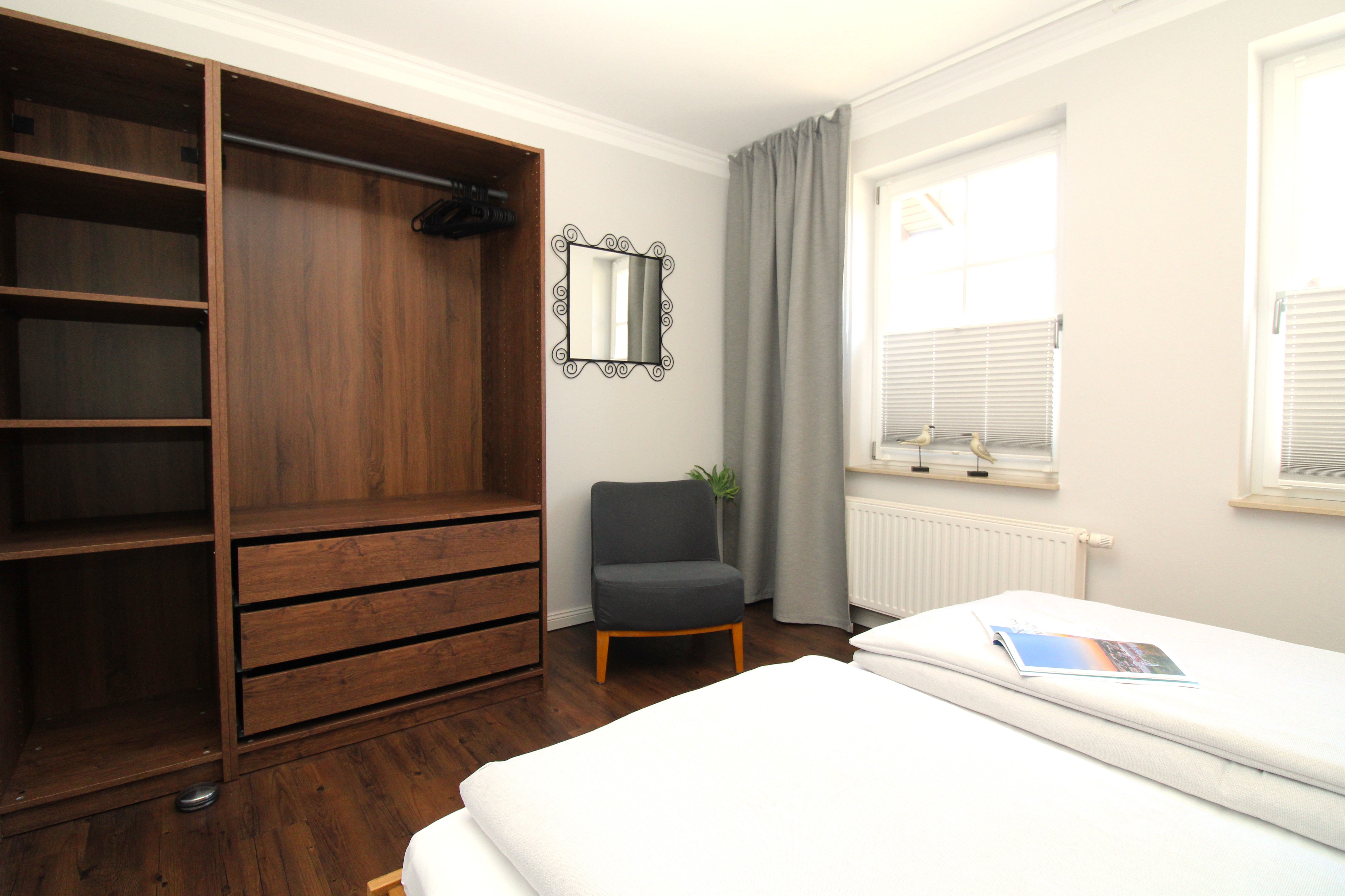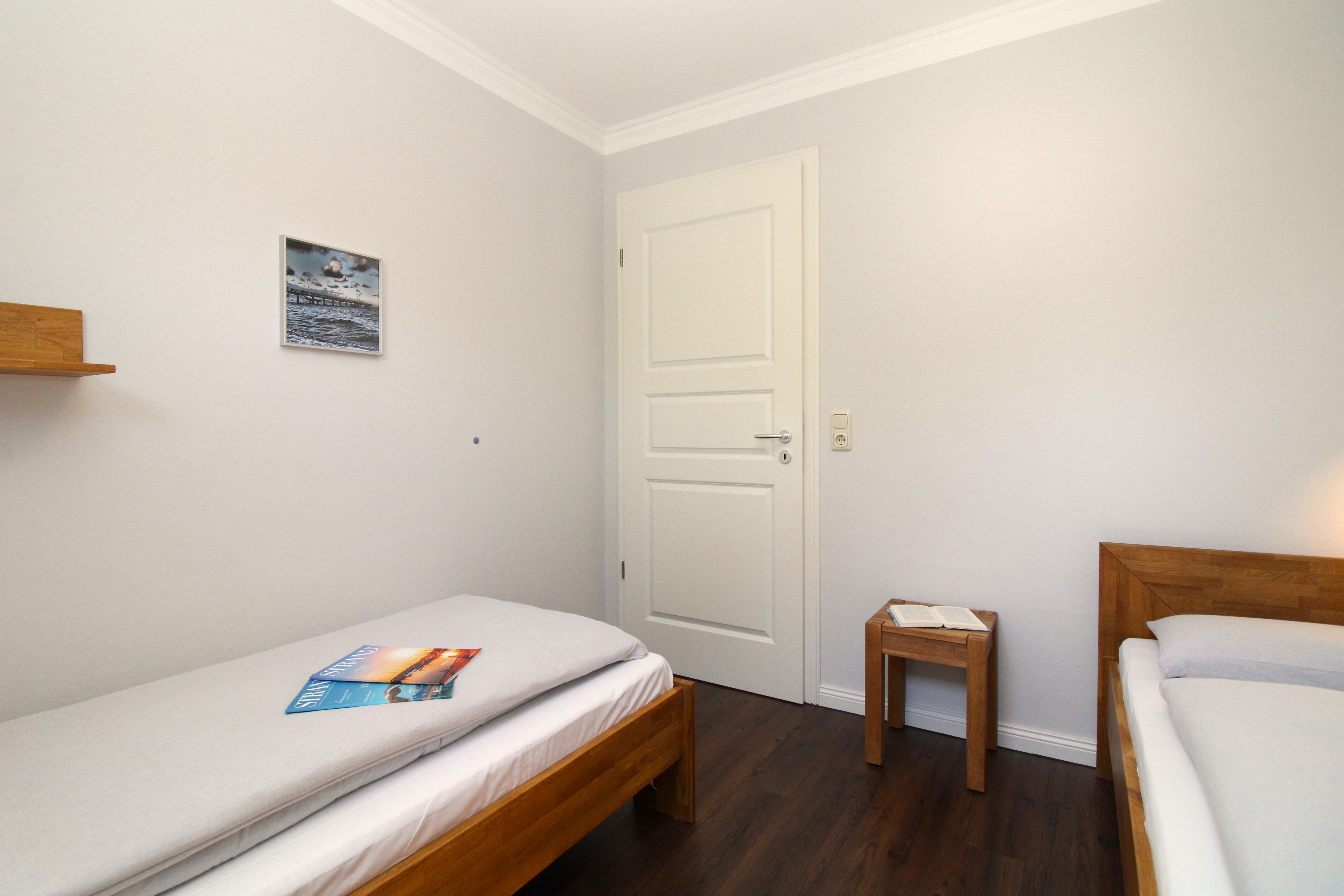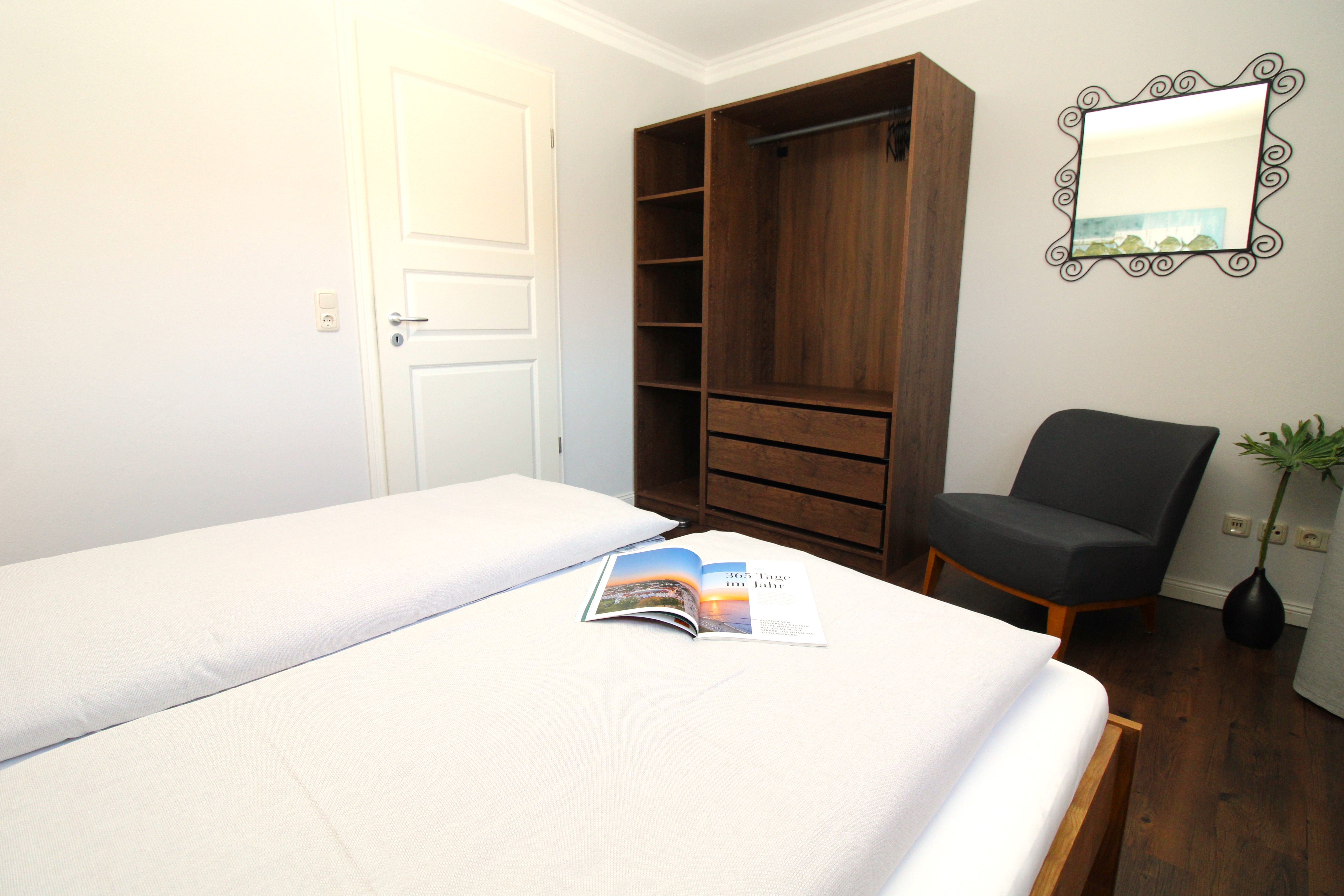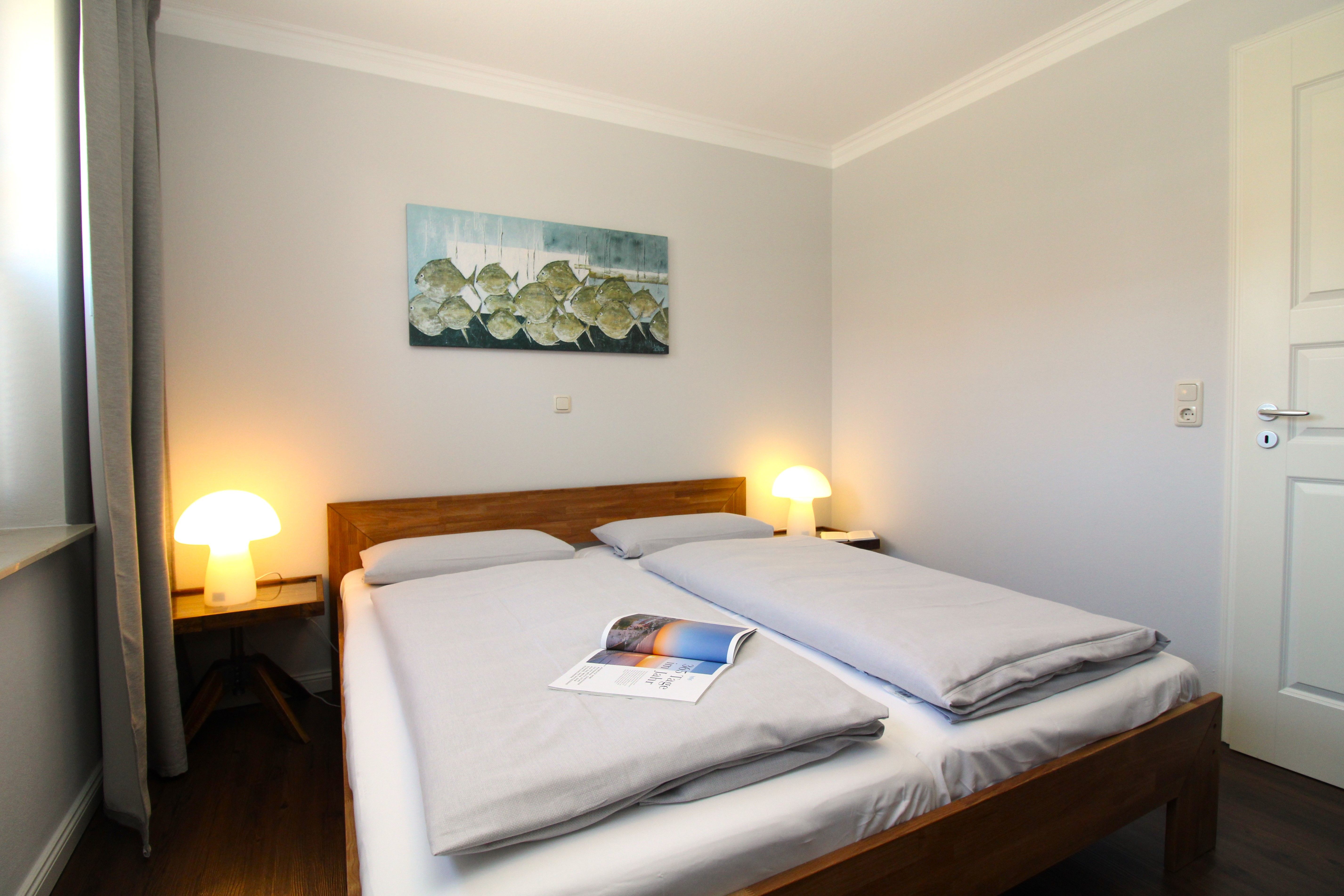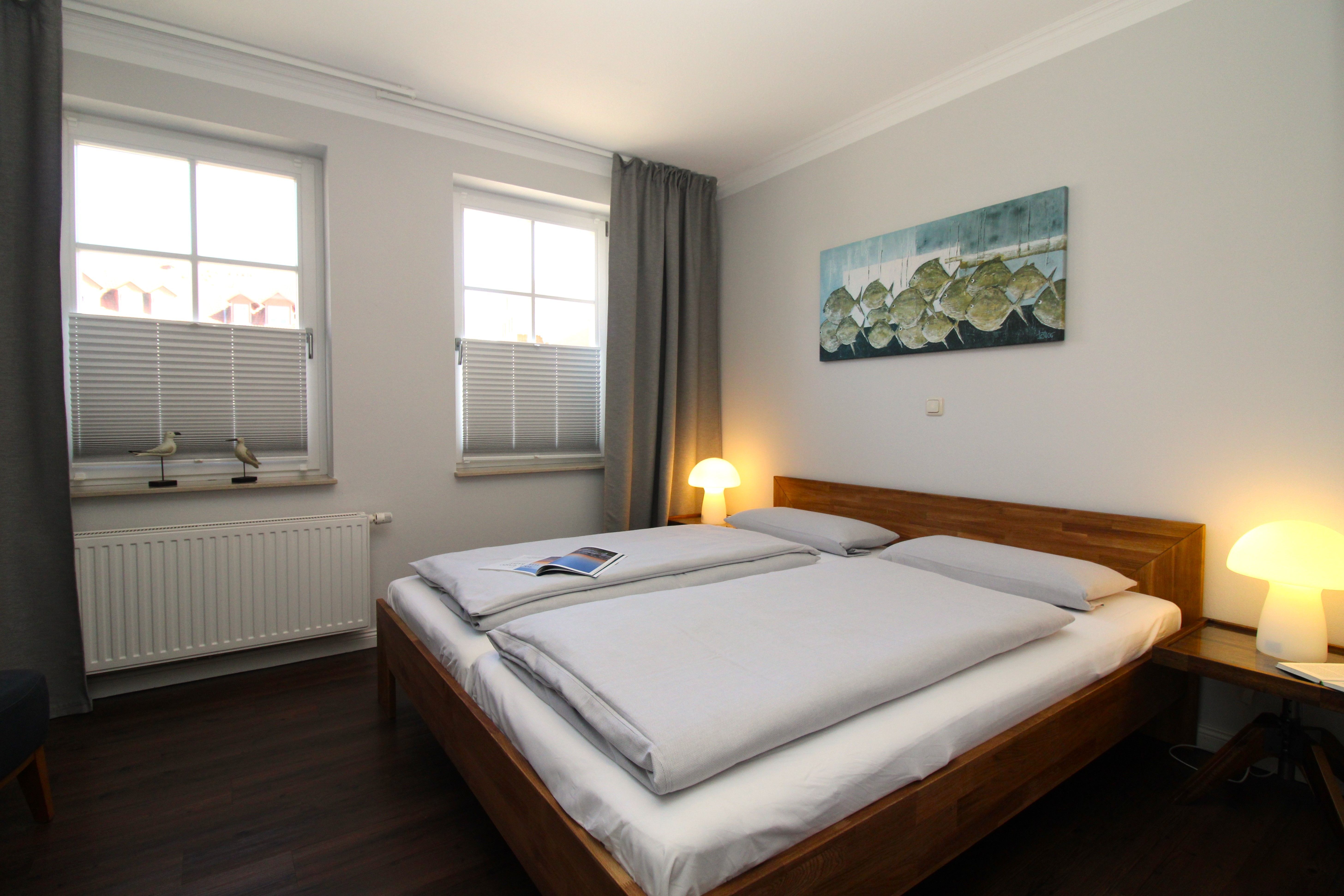 Im großen Schlafzimmer I befindet sich ein Doppelbett (180x200 cm) und im Schlafzimmer II, zwei Einzelbetten (jeweils 90x200 cm).