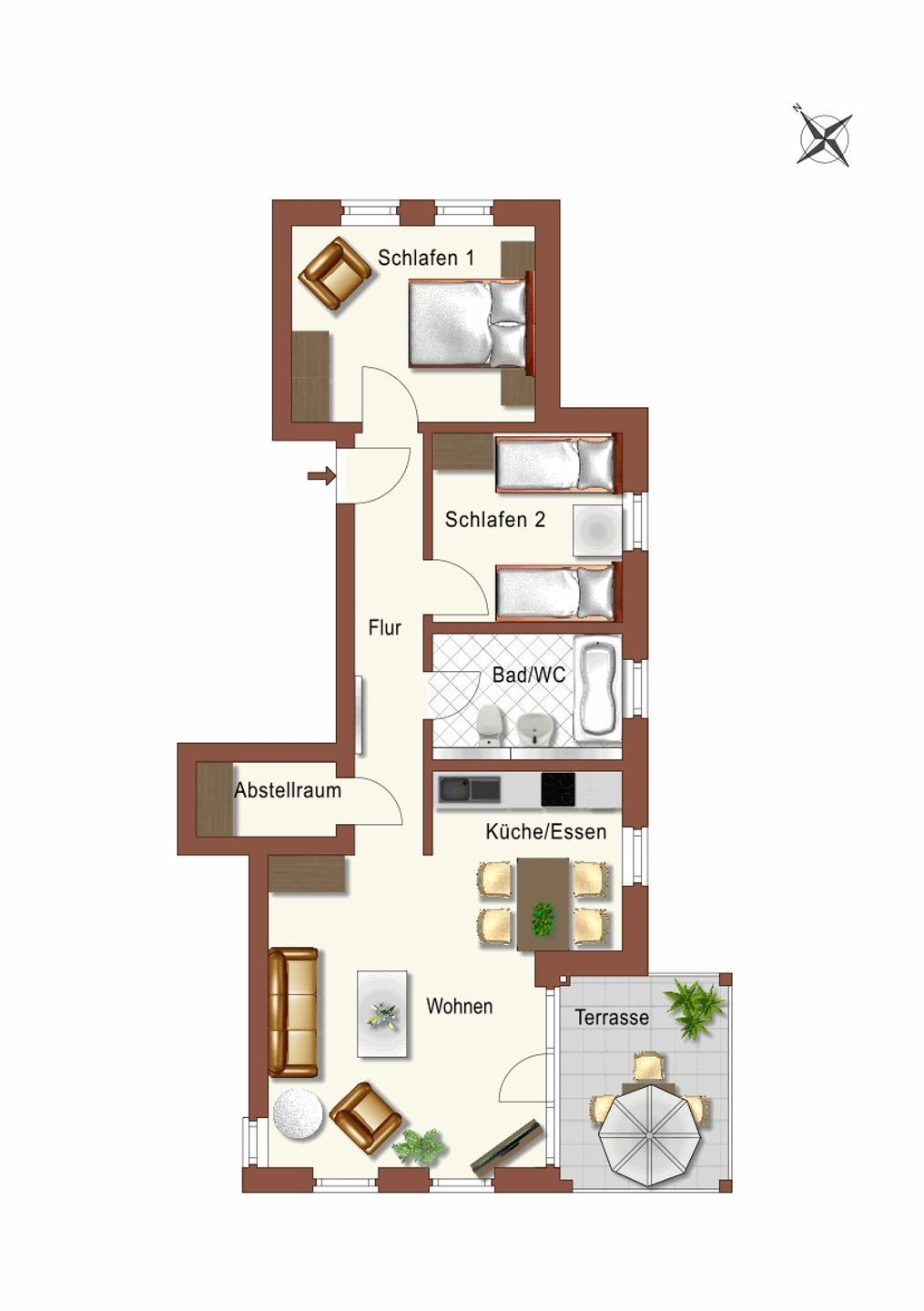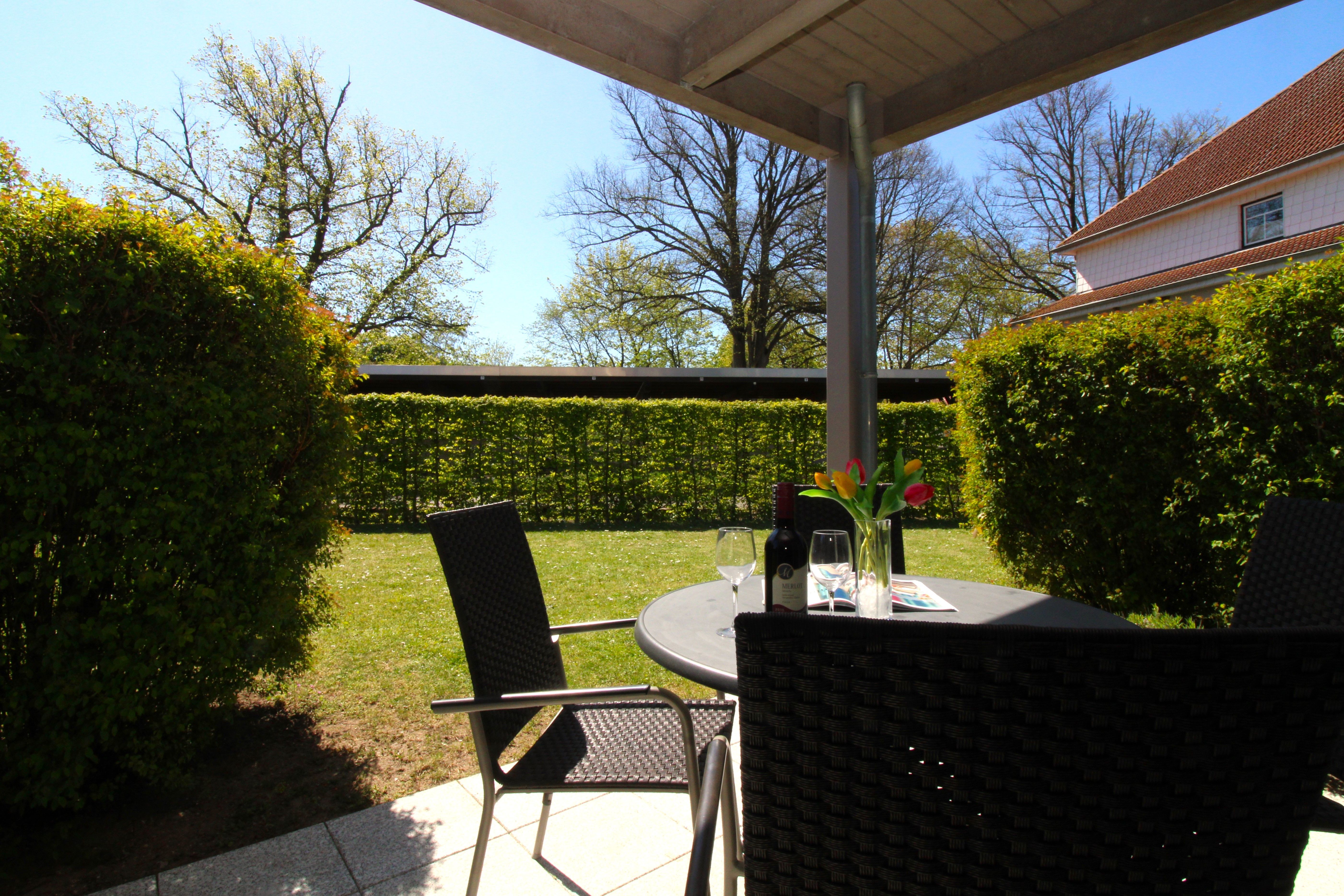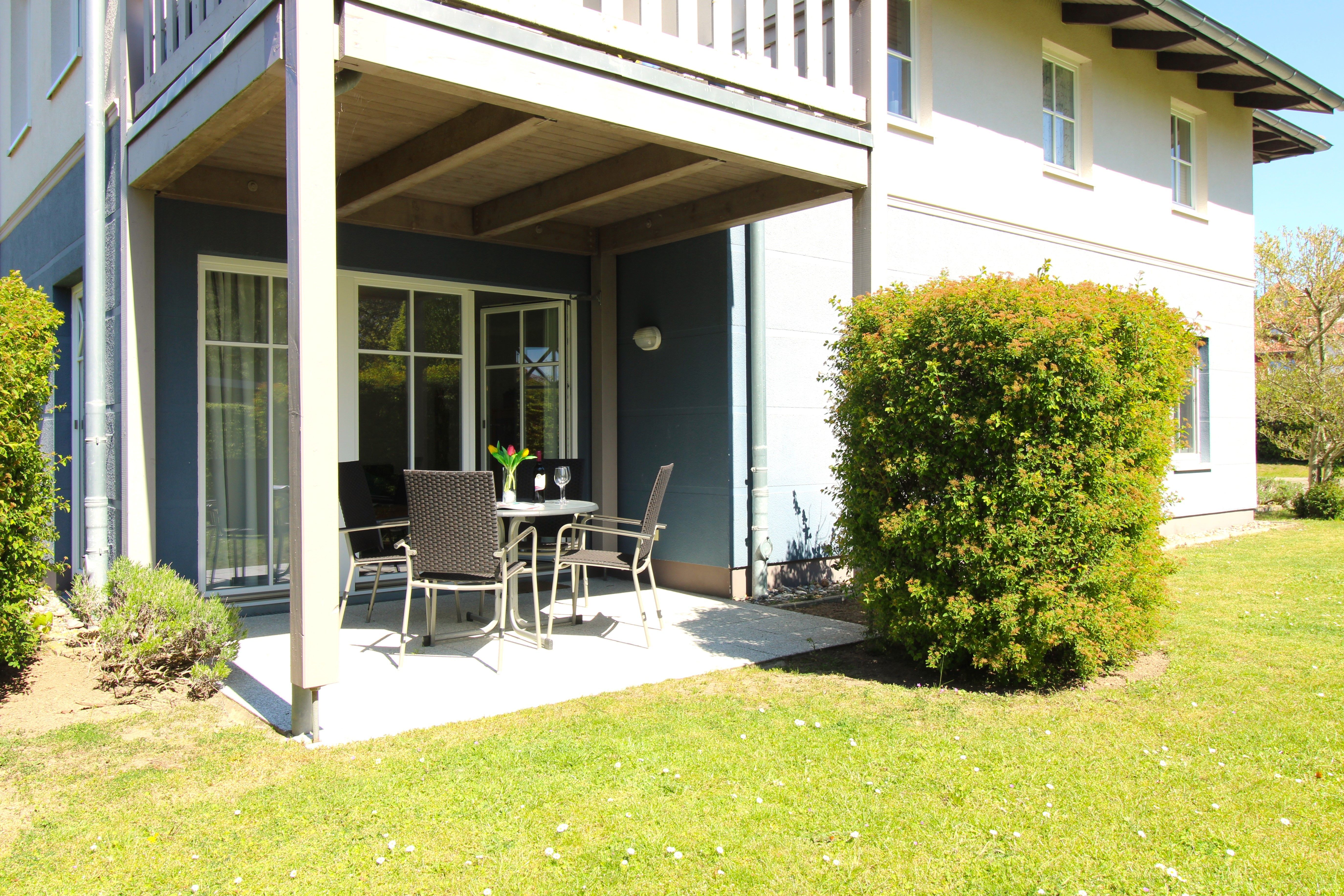Auf der Südterrasse steht eine gemütliche Sitzgruppe zum Frühstücken oder entspannen bereit.