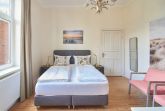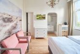 Das Doppelzimmer „Bernstein“ befindet sich im Hochparterre der Strandvilla „Dünenblick“, direkt an der Strandpromenade. Es überzeugt mit einer warmen Atmosphäre und einem besonderen Flair. Der Blick zur Landseite macht das Zimmer ideal für alle, die abseits vom Trubel entspannen möchten.