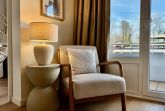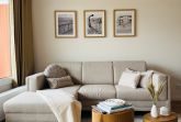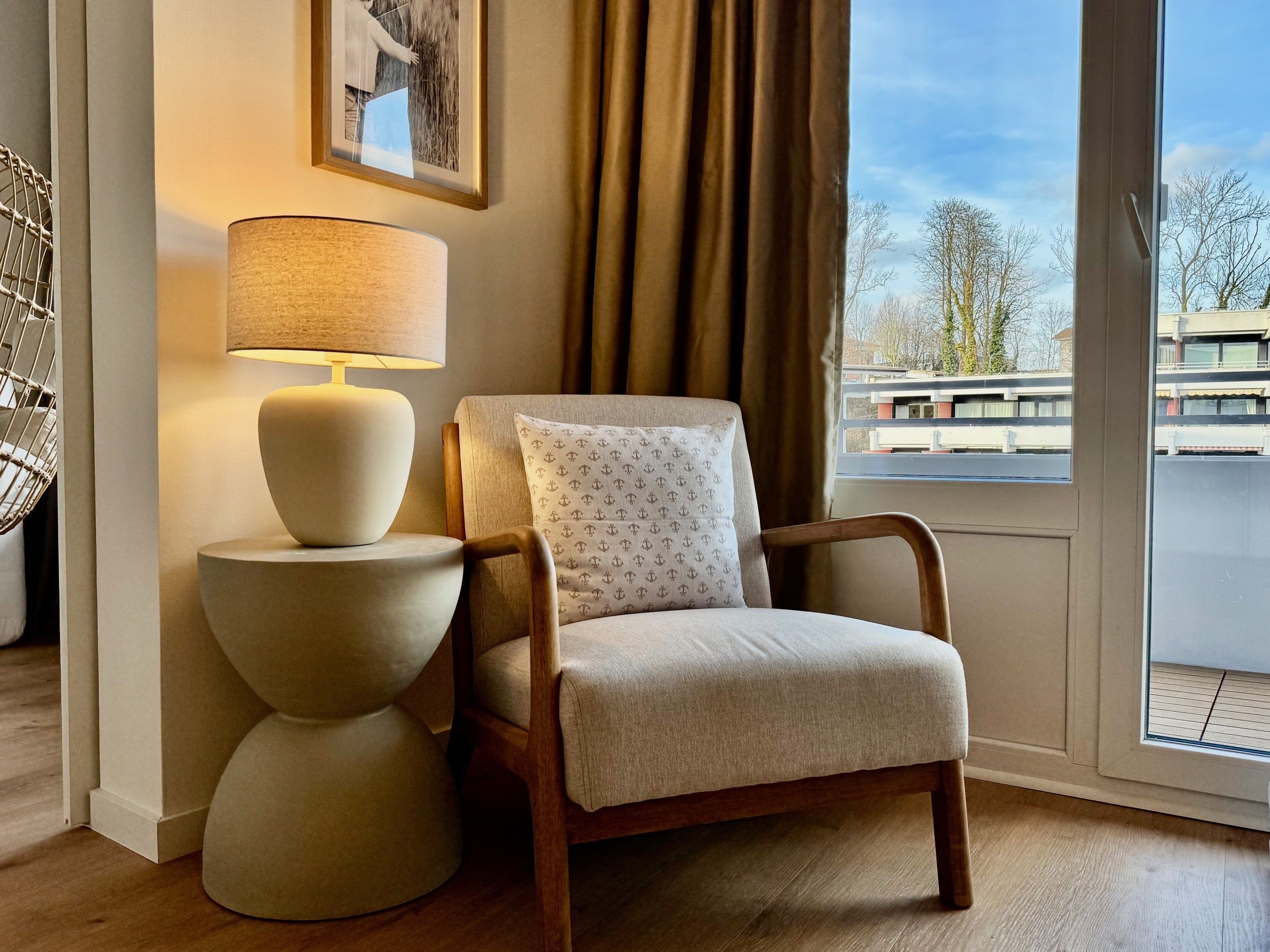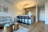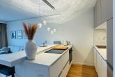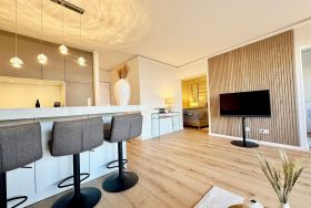 Das gesamte Apartment besticht durch ein angenehmes Raum- und Farbkonzept. Der großzügige Wohnbereich ist lichtdurchflutet und bietet durch die offene Küchenzeile mit Kochinsel und vier Barstühlen einen wohnlichen Komfort.