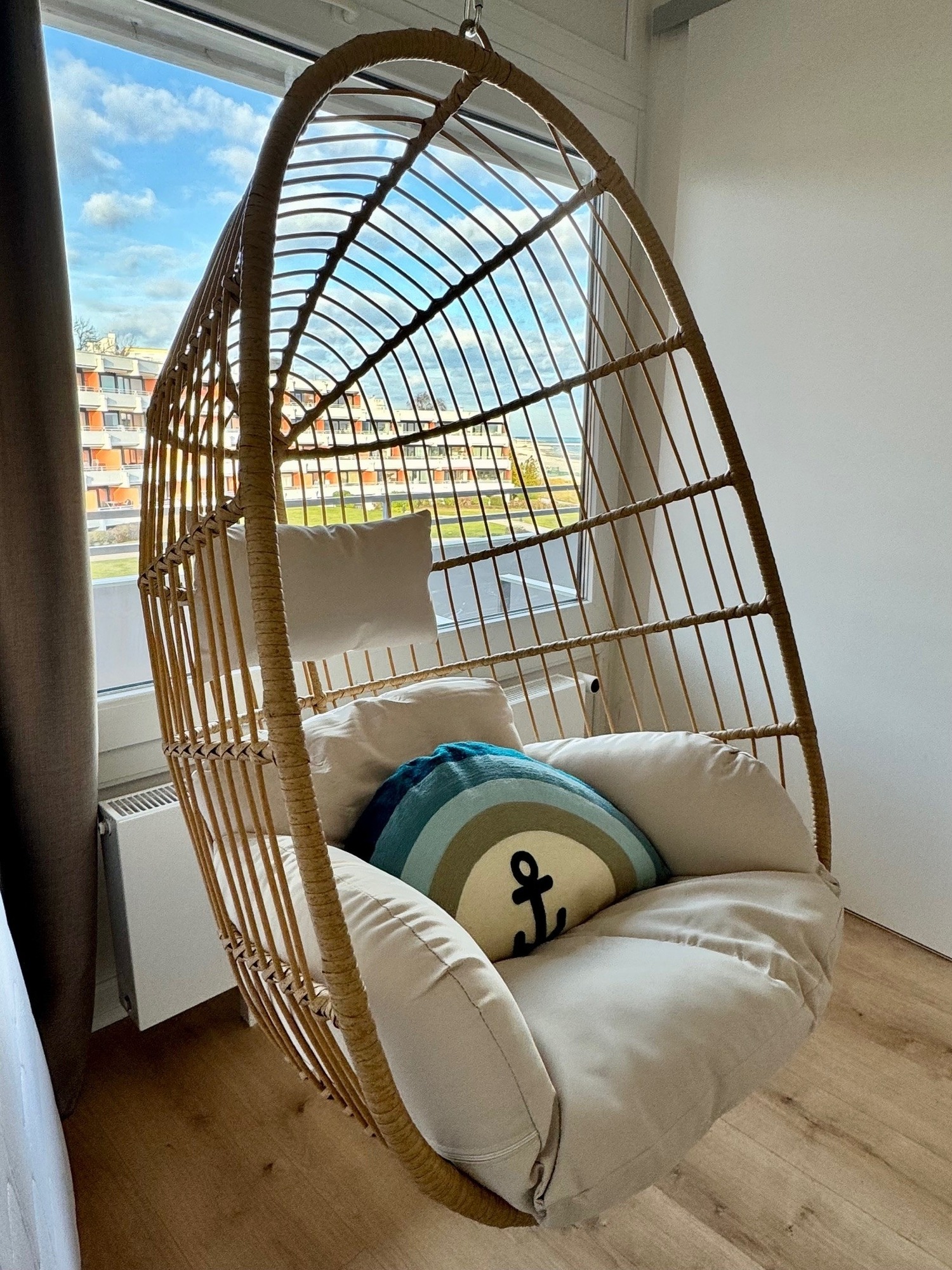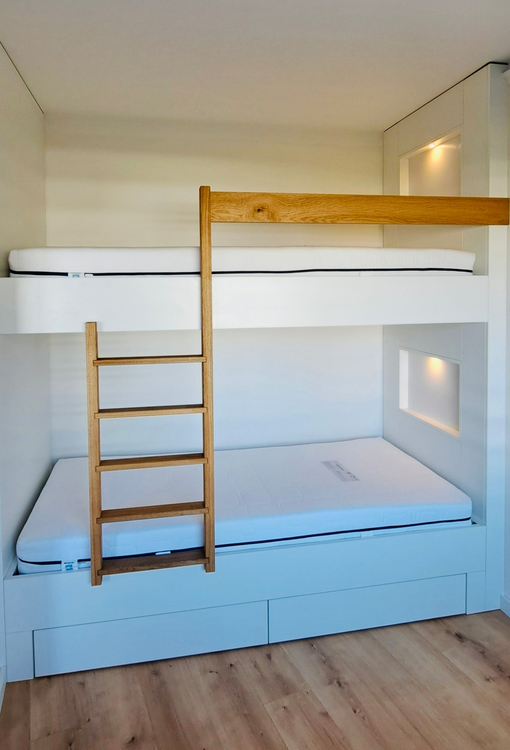 Das zweite Schlafzimmer verfügt über ein Doppelstockbett mit zwei 90x200cm großen Matratzen. Es ist mit einem Hängekorbsessel ausgestattet, von dem man den Seeblick genießen kann. Auch dieses Zimmer ist durch eine Schiebetür vom Wohnbereich getrennt.