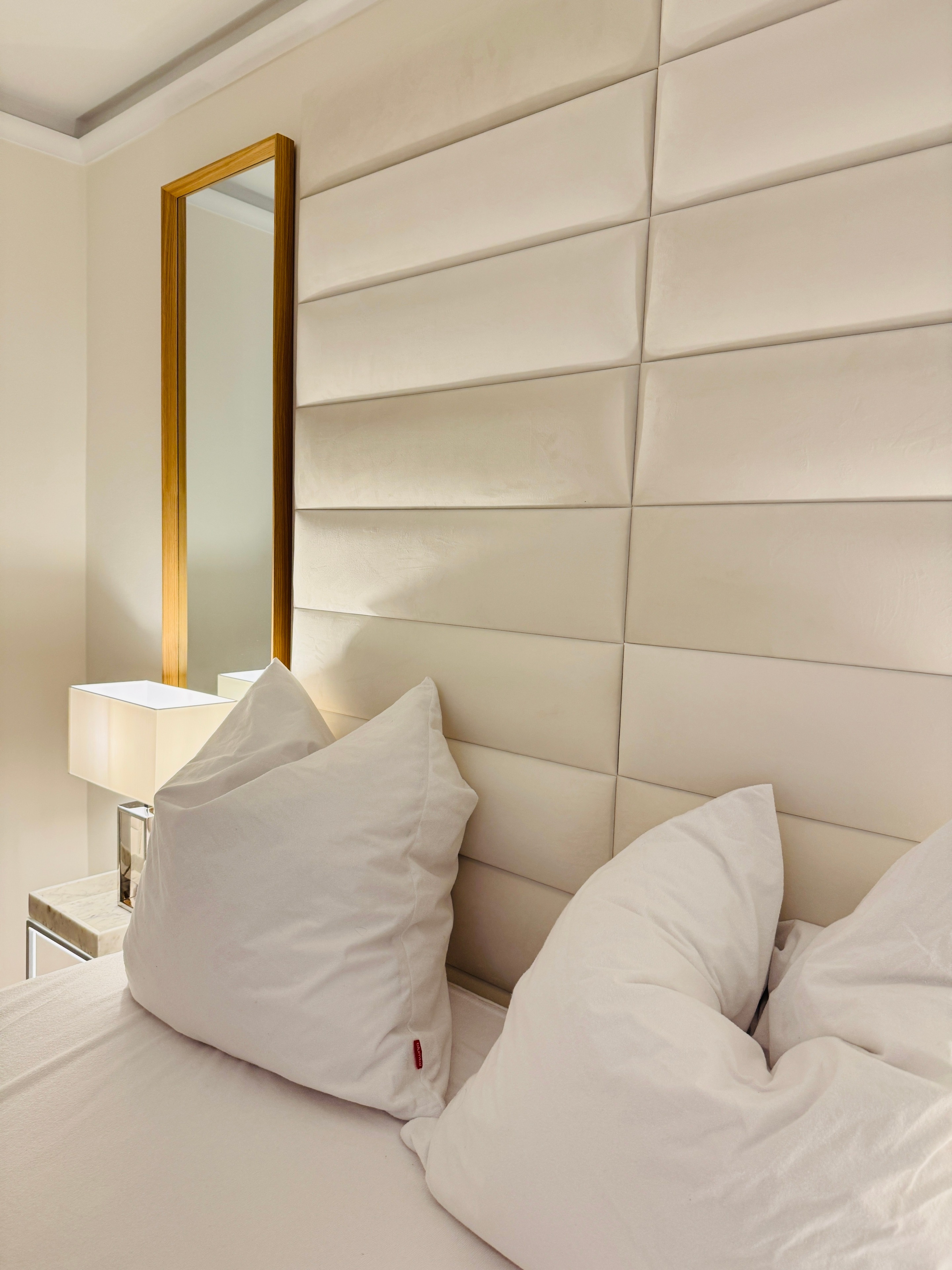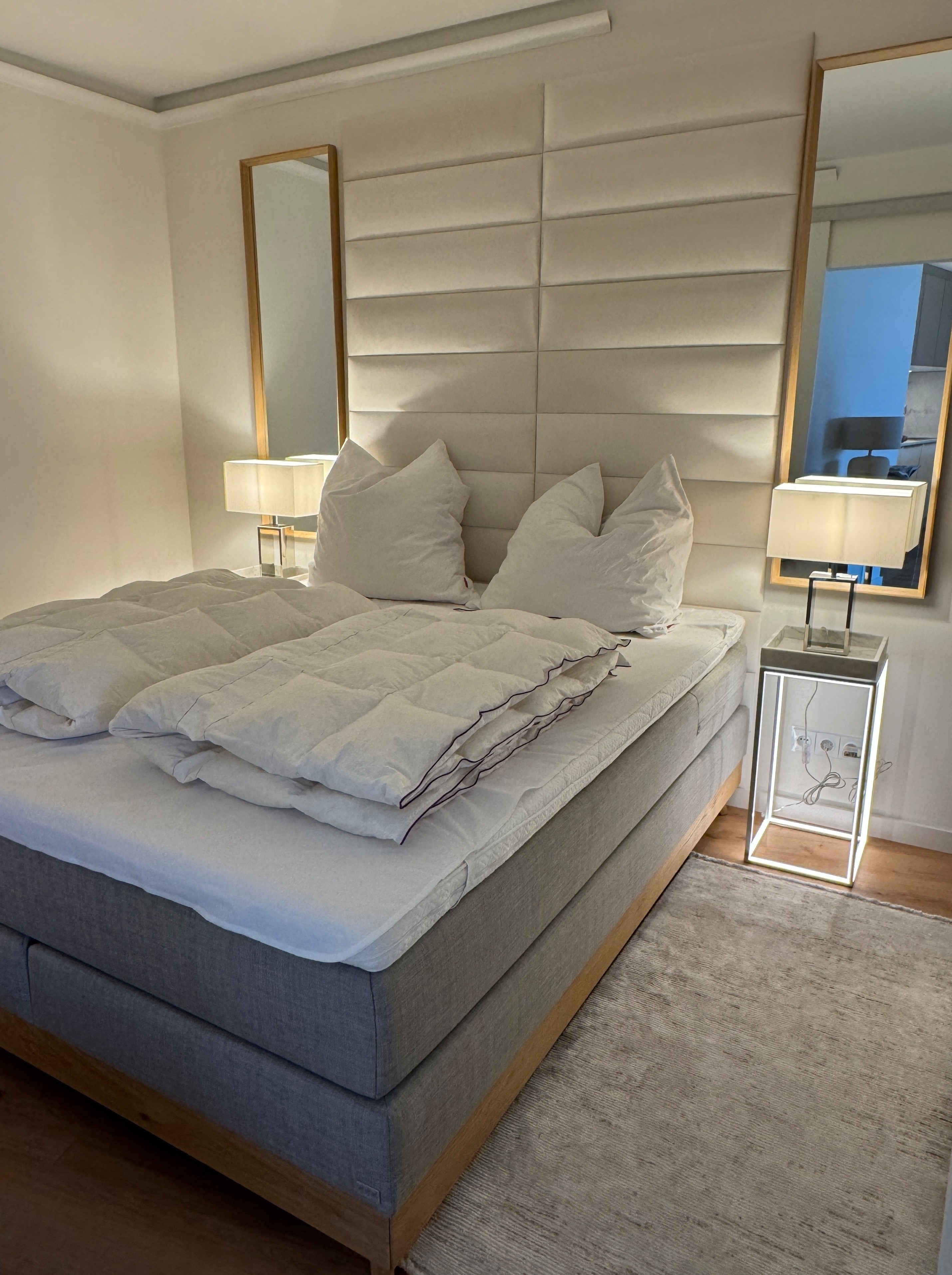 Das sanfte Farbkonzept in dem fensterlosen Schlafzimmer garantiert guten Schlaf. Es ist mit einem Boxspringbett mit französischem Bettenmaß von 160x200cm und einem sehr großzügigen Wandschrank ausgestattet. Durch eine breite Schiebtür ist dieses Schlafzimmer vom Wohnbereich getrennt.