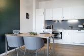 Die barrierearmen Apartments verfügen über WLAN, Fußbodenheizung, offene Küchen sowie eine hochwertige Inneneinrichtung und Ausstattung. Das harmonische Farbkonzept sorgt für Behaglichkeit und modernes Wohlgefühl. Zur Ausstattung der Ferienanlage gehören außerdem ein abschließbarer Fahrradraum, Waschmaschinen und Trockner zur gemeinschaftlichen Nutzung sowie eine Aufzugsanlage für den komfortablen Zugang zu allen Etagen. Öffentliche Parkplätze und eine Tiefgarage befinden sich in unmittelbarer Nähe.