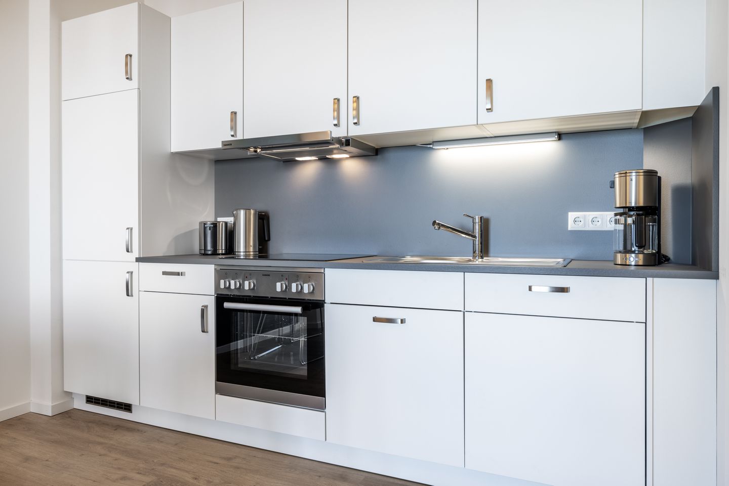 Das helle Apartment verfügt über bodentiefe Fenster, Fußbodenheizung, kostenfreies WLAN und eine voll ausgestattete offene Küche mit Geschirrspüler, Kühlschrank mit Tiefkühlfach, Herd mit 4 Glaskeramikkochfeldern und Backofen, Kaffeemaschine, Toaster, Wasserkocher und Mixstab. Im kombinierten Wohn-Essbereich befinden sich eine Doppelschlafcouch (1,40 x 2,00 m), ein Flatscreen-TV (42 Zoll), eine HiFi-Anlage sowie Gesellschaftsspiele. Genießt schöne Stunden auf dem Balkon mit direktem Blick zum Hafen. Das Schlafzimmer beinhaltet ein komfortables Boxspring-Doppelbett (1,80 x 2,00 m) und einen Flatscreen-TV (42 Zoll). Im geschmackvollen Badezimmer stehen euch eine ebenerdige Regendusche, ein Waschtisch, WC, ein Handtuchwärmer sowie ein Föhn zur Verfügung. Das Apartment verfügt über einen Safe für eine Laptopgröße bis ca. 17 Zoll.