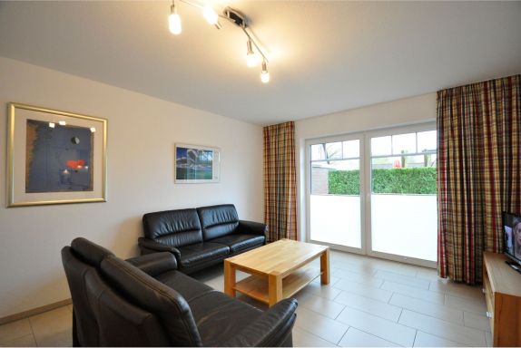 Die Wohnung verfügt über eine geschmackvolle Einrichtung, die den nordischen Stil mit modernem Komfort verbindet. Das Wohnzimmer ist mit bequemen Sofa und einem Flachbildfernseher ausgestattet, perfekt zum Entspannen nach einem Tag am Strand oder für gemütliche Abende. Die angrenzende Essbereich bietet Platz für 4 Personen und lädt zu gemeinsamen Mahlzeiten oder Spieleabenden ein.