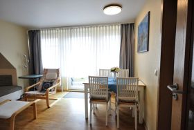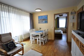 Die Ferienwohnung bietet Platz für bis zu vier Personen und ist ideal für Familien oder Paare, die einen erholsamen Urlaub am Meer planen. Mit zwei Schlafzimmern ausgestattet, finden Sie hier ausreichend Gemeinschaftsraum, um sich zurückzulehnen und den Alltagsstress hinter sich zu lassen. Das offene Wohnkonzept der Wohnung sorgt für ein lichtdurchflutetes Ambiente, während die gemütliche Sofaecke und der Essbereich zum Verweilen einladen.