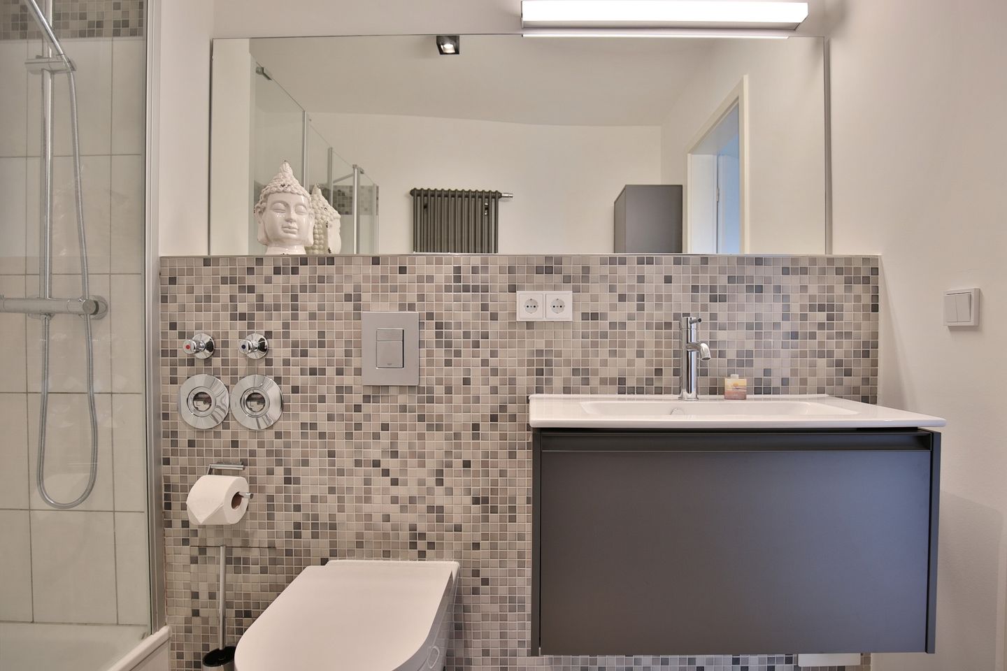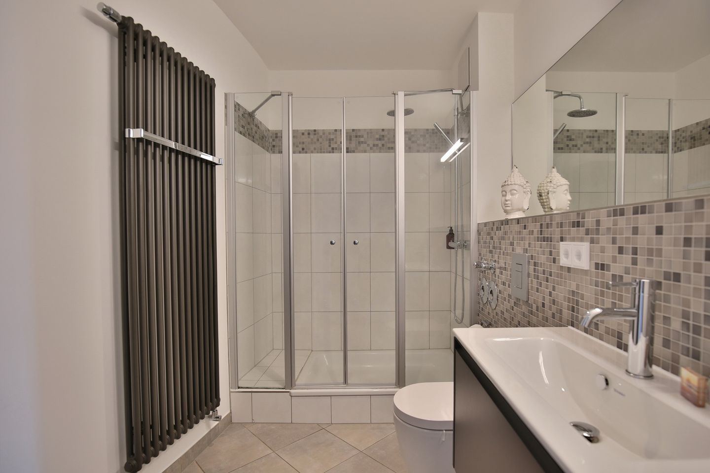 Das Badezimmer verfügt über eine Dusche, ein WC sowie Waschbecken und Spiegel und sorgt für den nötigen Komfort während Ihres Aufenthalts.