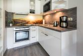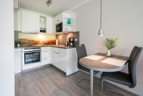 Im Wohnbereich erwartet Sie eine komplett eingerichtete Küchenzeile, die ideal für die Zubereitung Ihrer Lieblingsgerichte ist. Das Schlafzimmer ist mit einem gemütlichen Doppelbett ausgestattet und das Bad verfügt über eine Dusche und WC. Kostenfreies WLAN sowie die Erstausstattung mit Bettwäsche und Handtüchern sind ebenfalls inklusive (bitte bringen Sie Ihre eigenen Strandtücher mit).