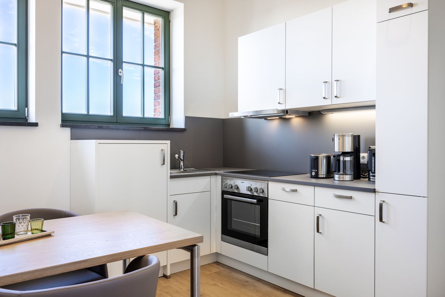 Die barrierearmen Apartments verfügen über WLAN, Fußbodenheizung, offene Küchen sowie eine hochwertige Inneneinrichtung und Ausstattung. Das harmonische Farbkonzept sorgt für Behaglichkeit und modernes Wohlgefühl. Zur Ausstattung der Ferienanlage gehören außerdem ein abschließbarer Fahrradraum, Waschmaschinen und Trockner zur gemeinschaftlichen Nutzung sowie eine Aufzugsanlage für den komfortablen Zugang zu allen Etagen. Öffentliche Parkplätze und eine Tiefgarage befinden sich in unmittelbarer Nähe.