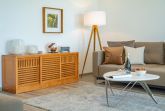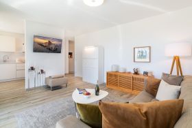 Der lichtdurchflutete Wohnbereich empfängt Sie mit einem gemütlichen Sofa und einem modernen Smart-TV. Von hier aus gelangen Sie direkt auf die großzügige Südost-Terrasse, um Ihre Mahlzeiten im Freien zu genießen und dabei den Blick in die liebevoll gestaltete Gartenanlage sowie auf das glitzernde Wasser des Stettiner Haffs schweifen zu lassen.