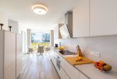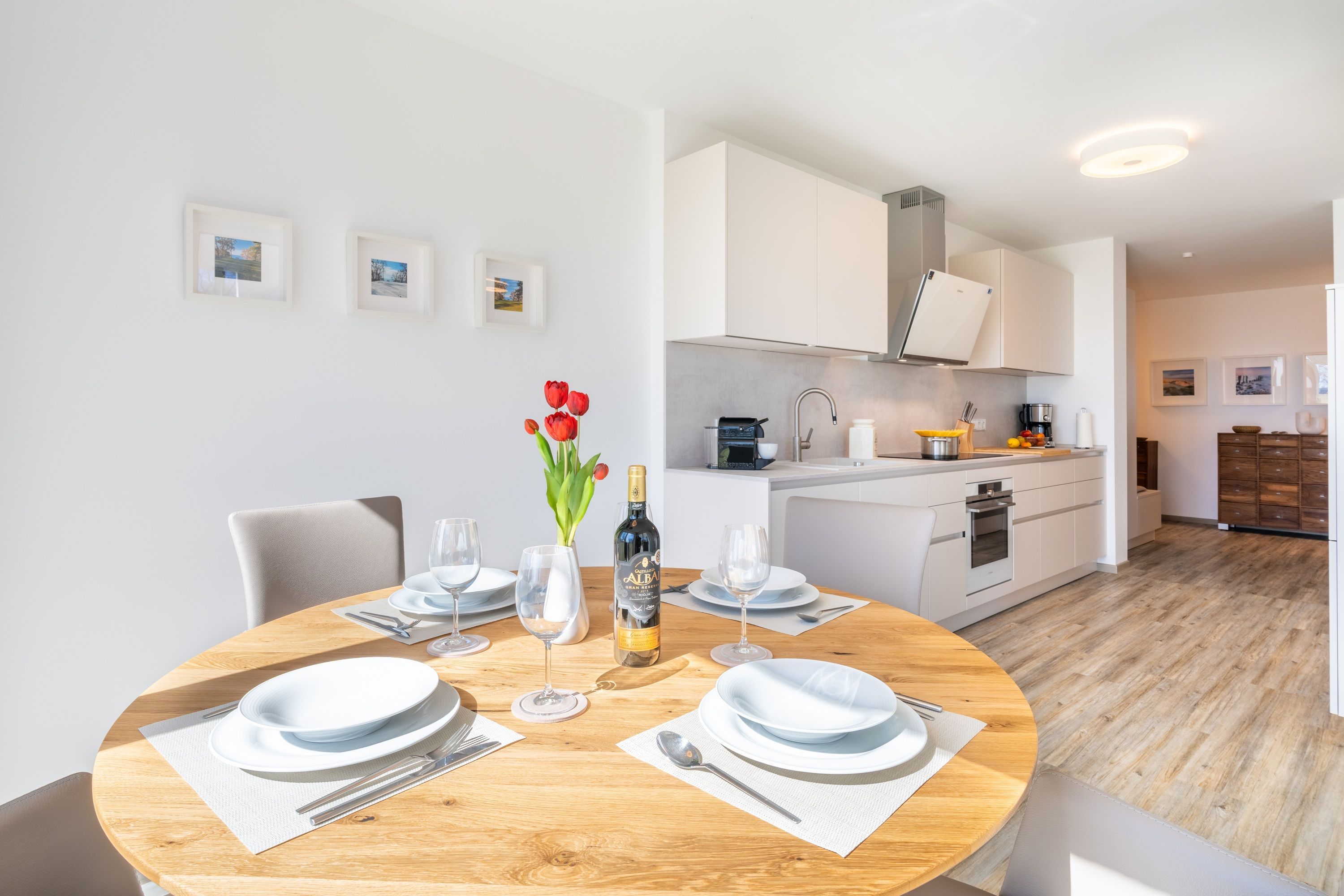 Die moderne Küchenzeile ist mit hochwertigen Markengeräten ausgestattet, darunter ein Herd, eine Kaffeefiltermaschine, eine Nespresso-Maschine, eine Mikrowelle, ein Backofen, ein Kühlschrank mit Gefrierfach sowie eine Spülmaschine. In den Schränken finden Sie ausreichend Geschirr, Besteck sowie Töpfe und Pfannen. Der Esstisch lädt ein, gemeinsam ein Frühstück zu genießen, während Sie vielleicht einen Fischer beim Auswerfen seiner Netze beobachten können.