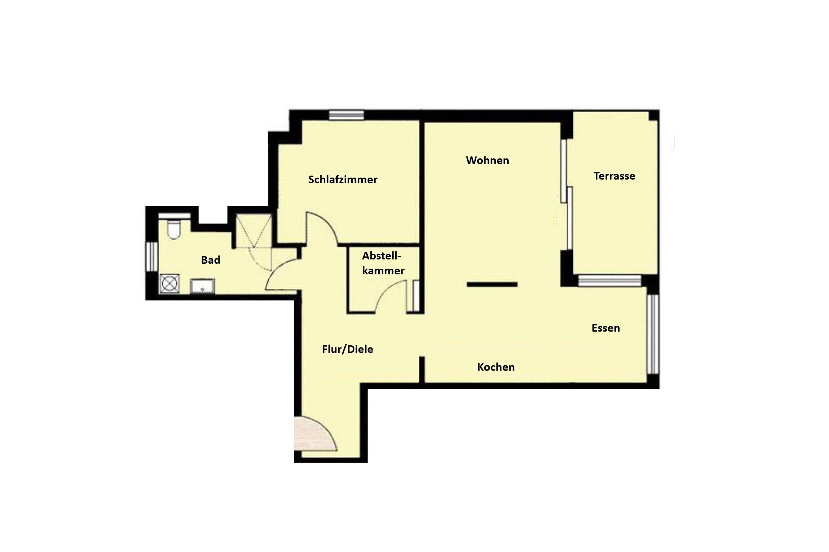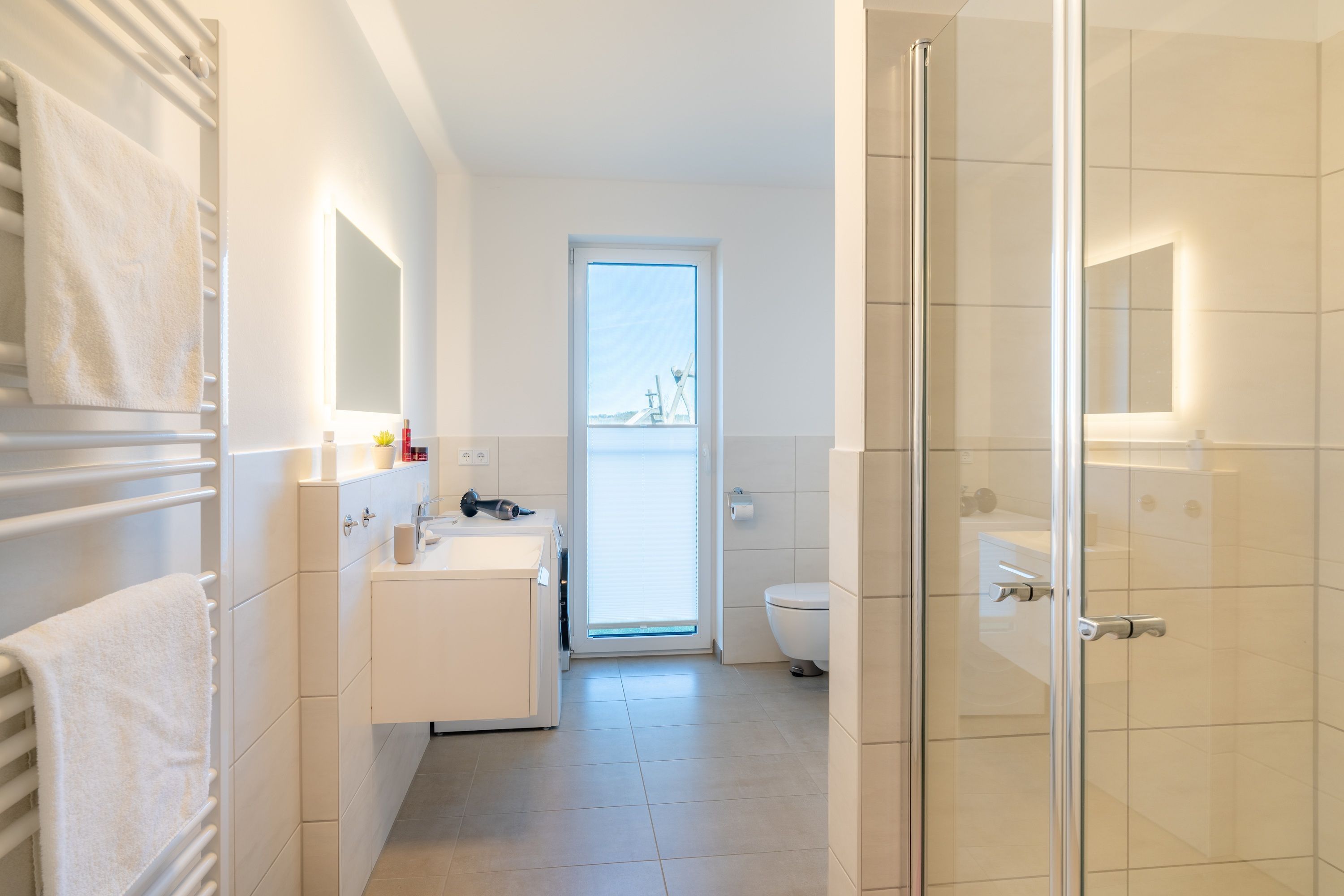 Das geschmackvoll eingerichtete Badezimmer bietet Ihnen alles, was Sie für Ihr Wohlbefinden brauchen: eine großzügige, ebenerdige Dusche sorgt für erfrischende Momente, während Waschtisch, WC, Waschmaschine und ein Fön den Komfort perfekt abrunden. Ein Ort, an dem Sie entspannt in den Tag starten oder ihn sanft ausklingen lassen können.