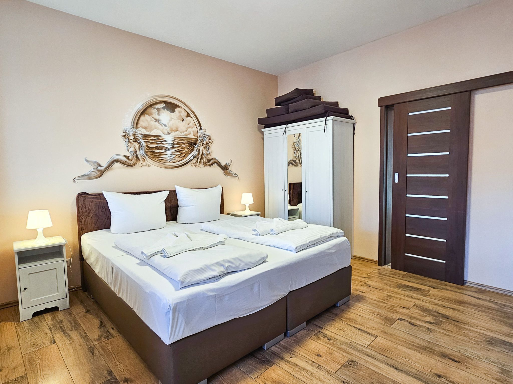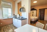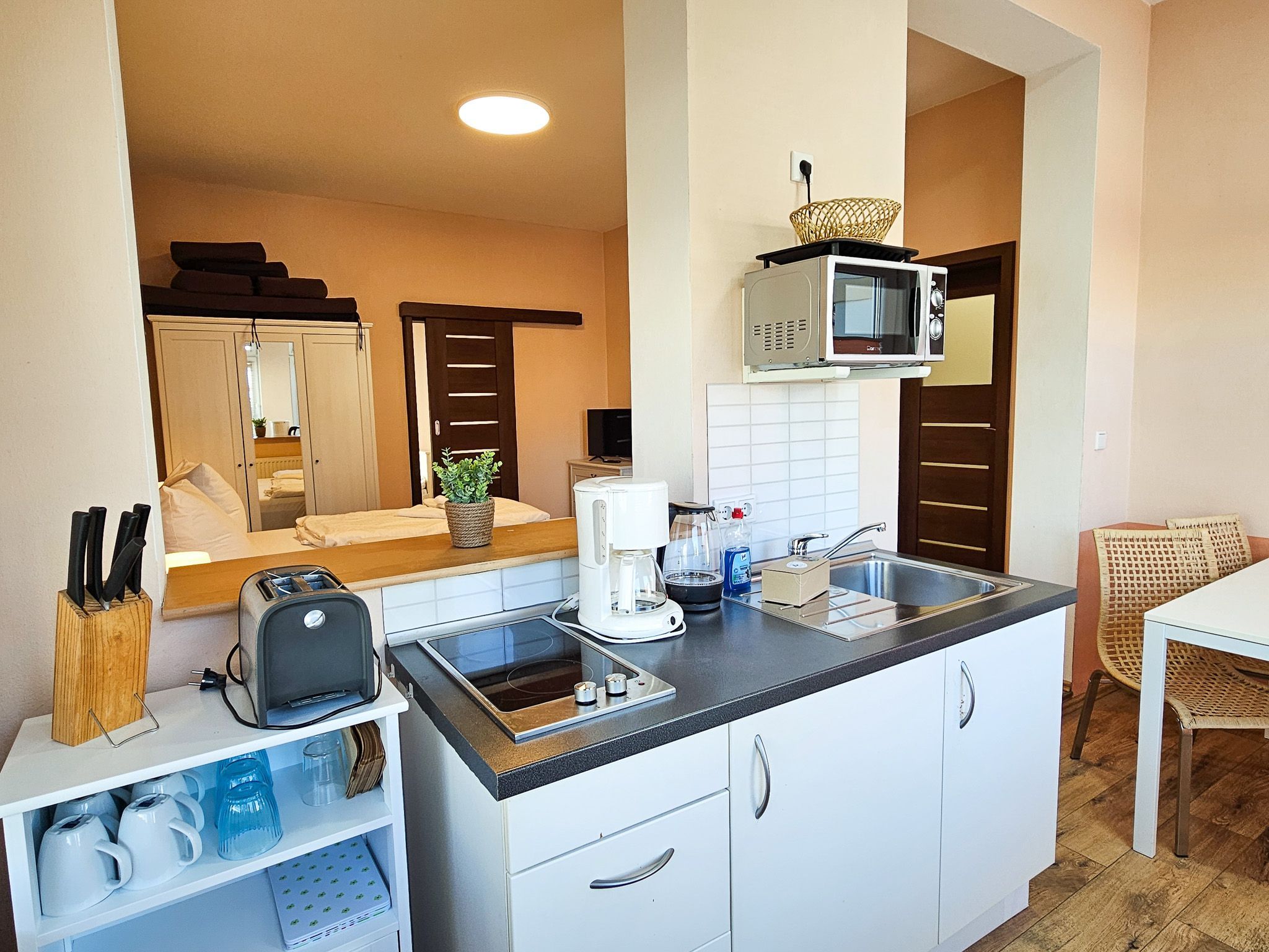 Das gemütlich eingerichtete Appartement verfügt über einen Wohn-/ Schlafbereich mit einem Doppelbett und einer separierten Sitzgelegenheit mit einer kleinen Pantry-Küche. Von hier aus gelangen Sie auf die große süd-westlich ausgerichtete Terrasse.