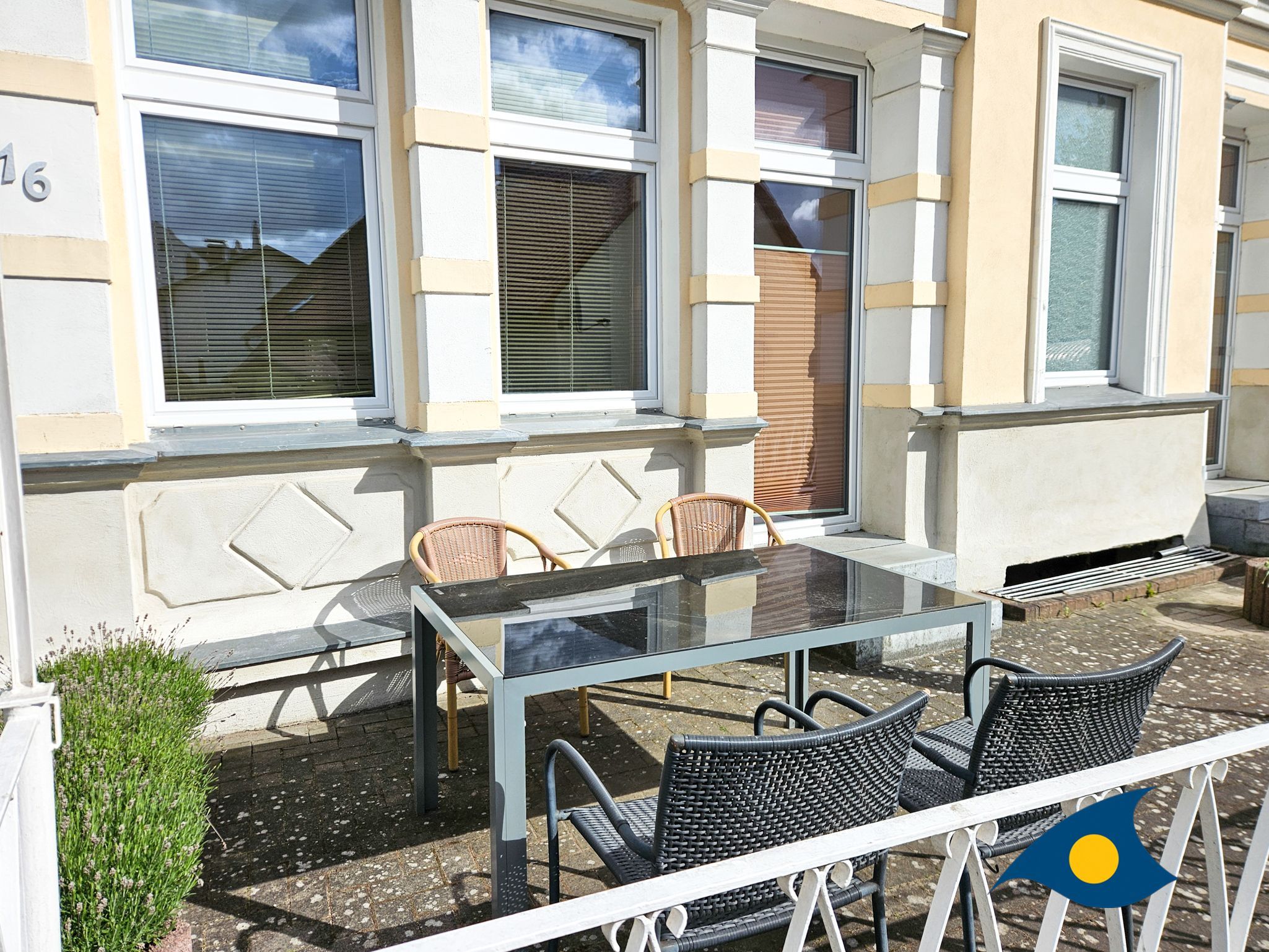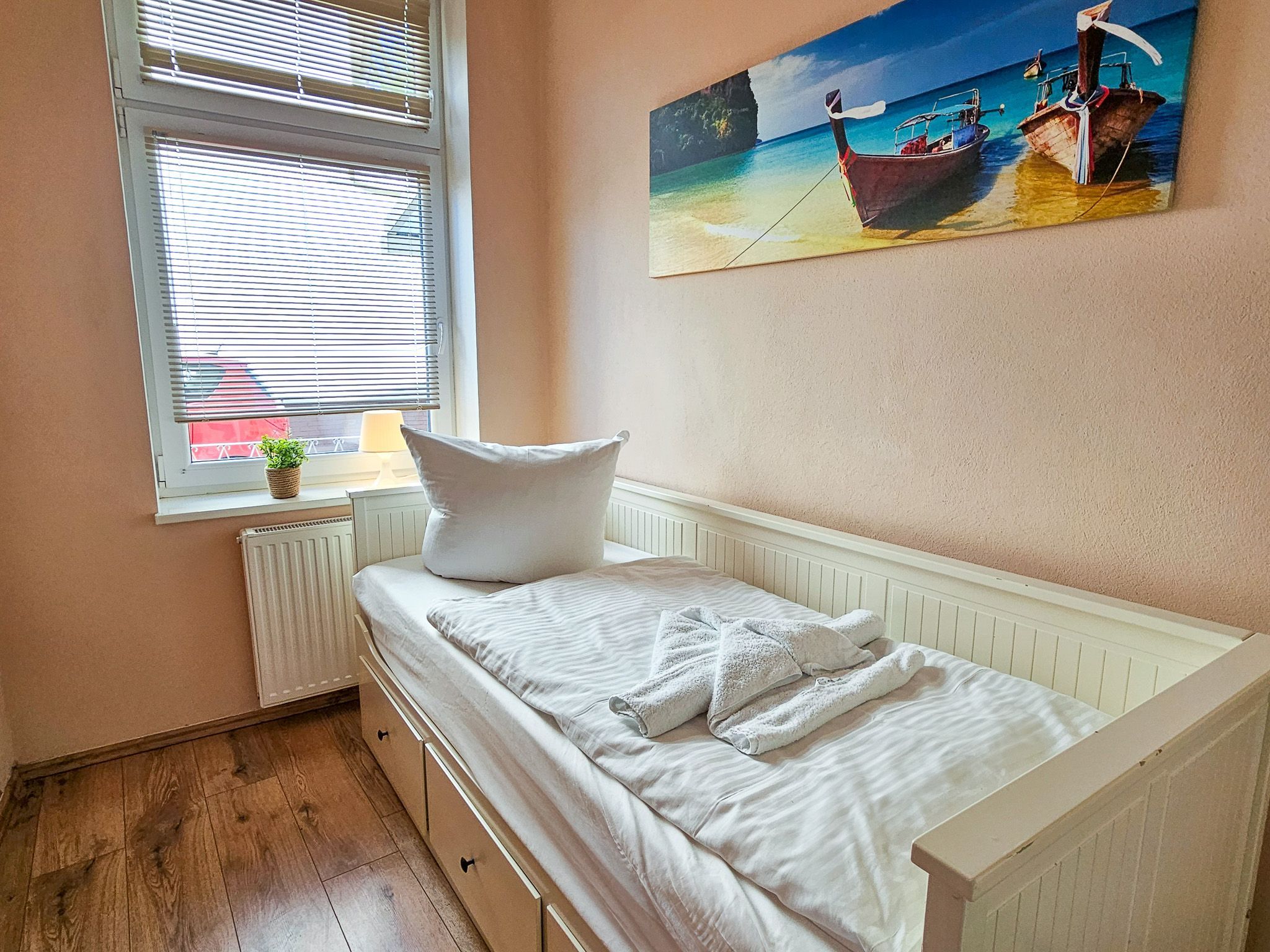 Die 34m² große Ferienwohnung befindet sich im Erdgeschoss der Villa Utpatel und bietet Platz für zwei Erwachsene und ein Kind bis 14 Jahre.