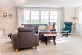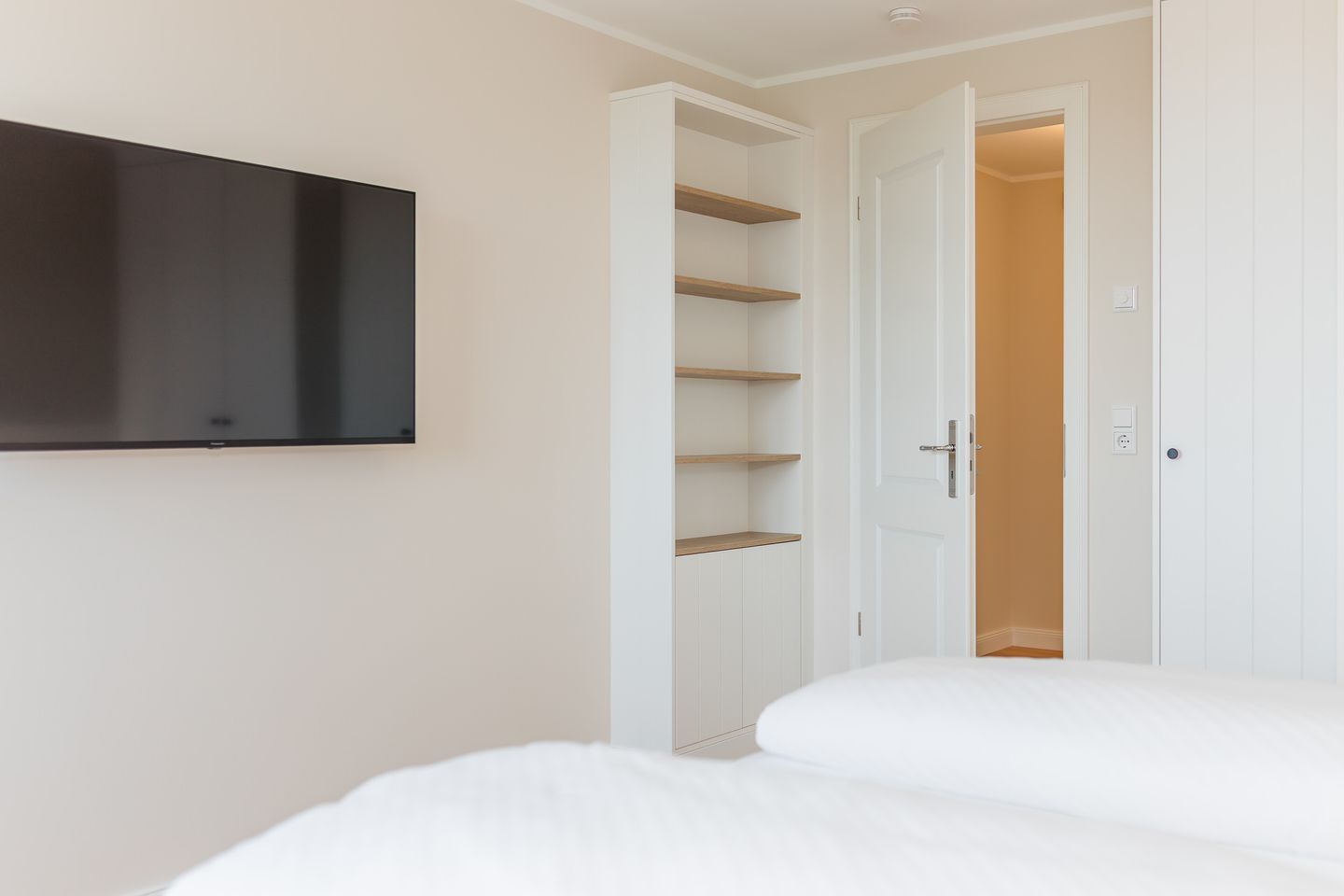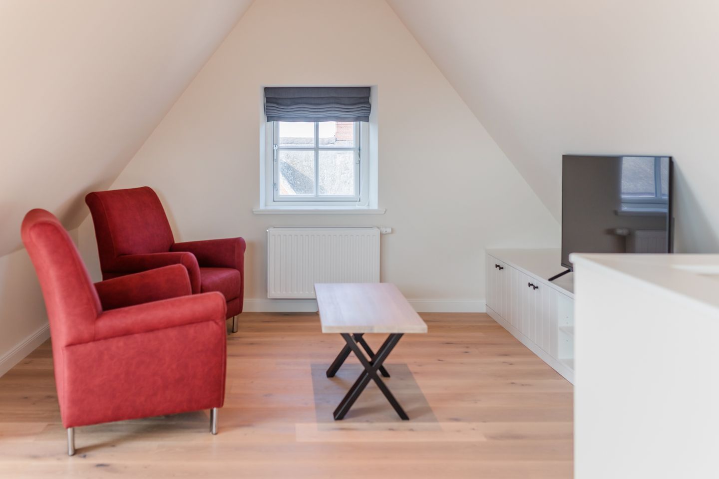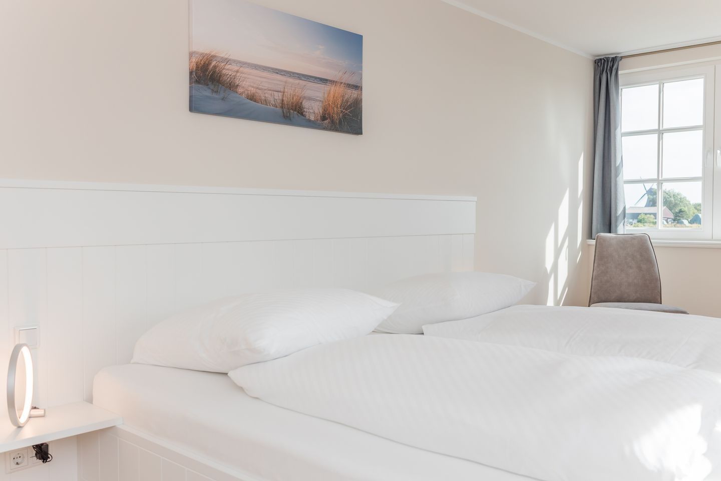 Das Dachgeschoss stellt ein Highlight der Unterkunft dar. Es ist als großzügiges drittes Schlafzimmer eingerichtet und bietet über die große Fensterfront einen herrlichen Blick über Felder bis zur Nordsee.
