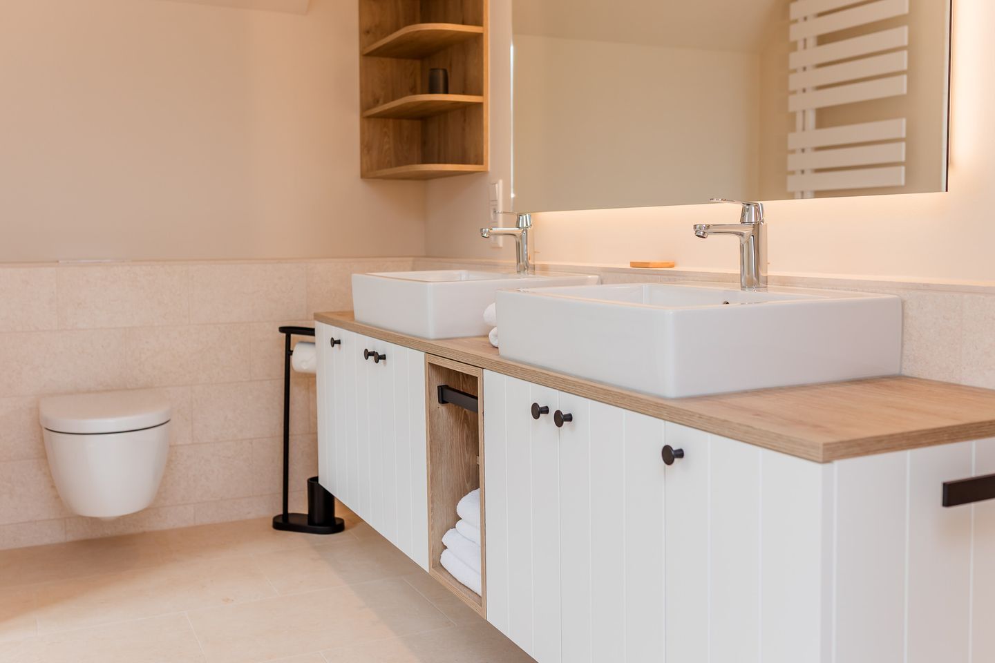 Im Obergeschoss sind zwei Schlafzimmer - beide mit je einem Doppelbett und einem Smart-TV ausgestattet -, sowie zwei Duschbäder. In einem der Bäder stehen Ihnen eine Waschmaschine und ein Trockner zur Verfügung.