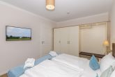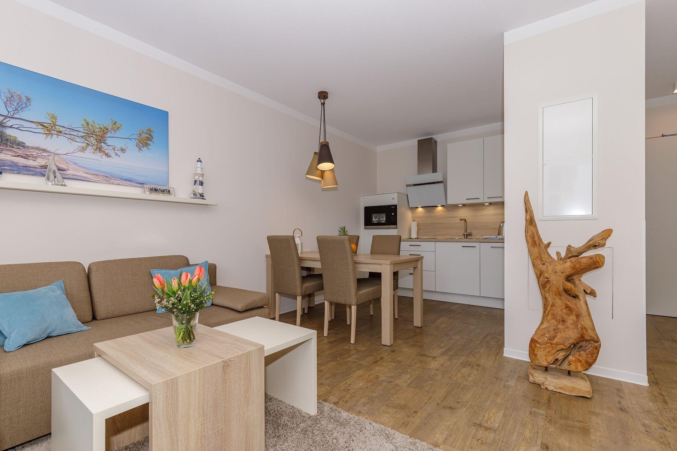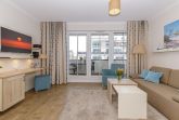Die exklusive Ferienwohnung befindet sich in westlicher Lage in der 1. Etage des Aparthotels und bietet auf 49 m² viel Platz für bis zu 4 Personen. Der gemütliche Wohnbereich besitzt ein bequemes Sofa, welches sich mit wenigen Handgriffen zu einer Doppelschlafcouch (1,40m x 2,00m) umfunktionieren lässt, und sorgt mit einem Flatscreen-TV für reichlich Entertainment.