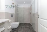 Die offene Regendusche ist das Highlight des Badezimmers und ausgestattet mit einem Handtuchwärmer, einem Waschtisch mit Kosmetikspiegel und einem Haartrockner.