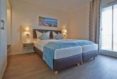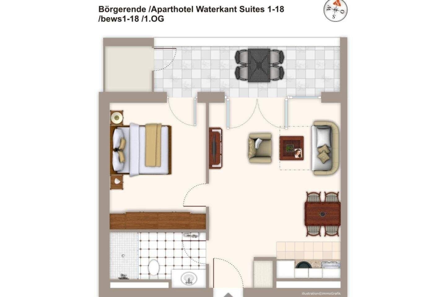 Der überdachte Balkon ist sowohl vom Wohnzimmer als auch vom Schlafzimmer aus begehbar. Natürlich stehen Ihnen hier auch Terrassenmöbel zur Verfügung, sodass Sie beispielsweise Ihr Frühstück oder Ihr Abendessen ganz privat im Sonnenschein zu sich nehmen können. Die Waterkant Suites liegen an der Promenade in Börgerende und somit direkt am Meer.