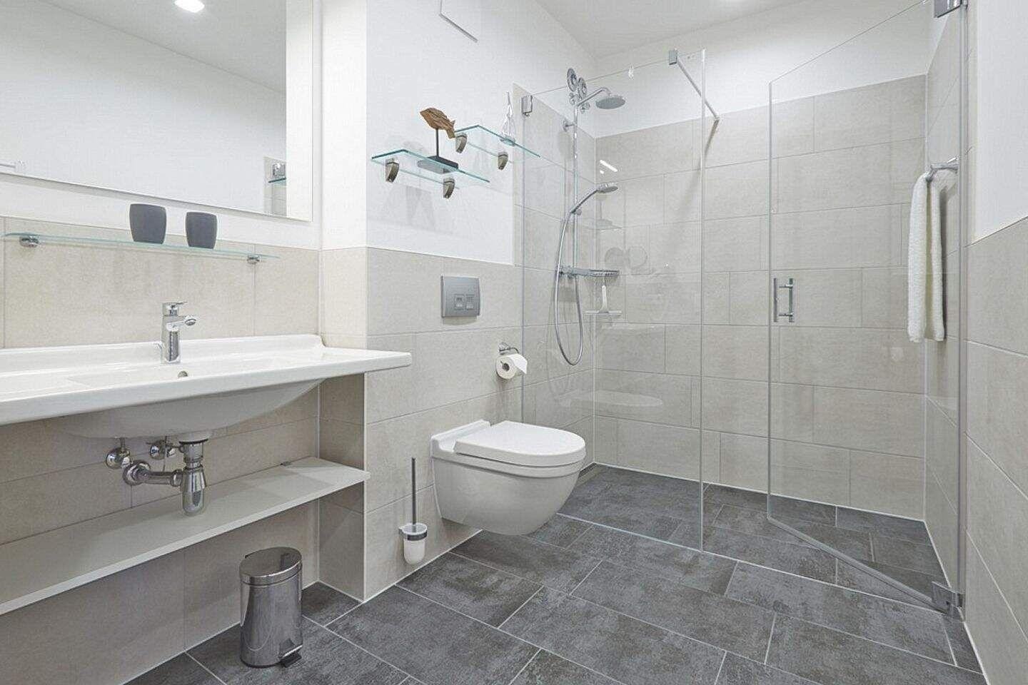 Die offene Regendusche ist das Highlight des Badezimmers. Es ist weiterhin ausgestattet mit einem Handtuchwärmer, einem Waschtisch mit Kosmetikspiegel und einem Haartrockner.