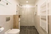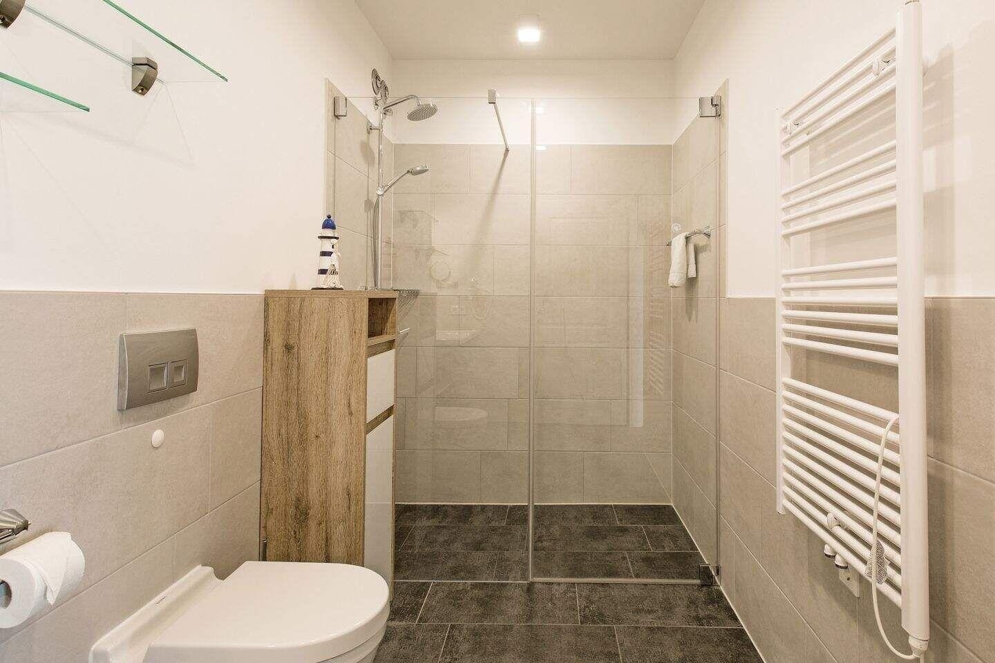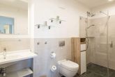 Im stilvollen Badezimmer befinden sich eine großzügige begehbare Regendusche, ein Waschtisch mit Haartrockner und Kosmetikspiegel, ein Regalschrank, eine Personenwaage, sowie ein Handtuchwärmer.