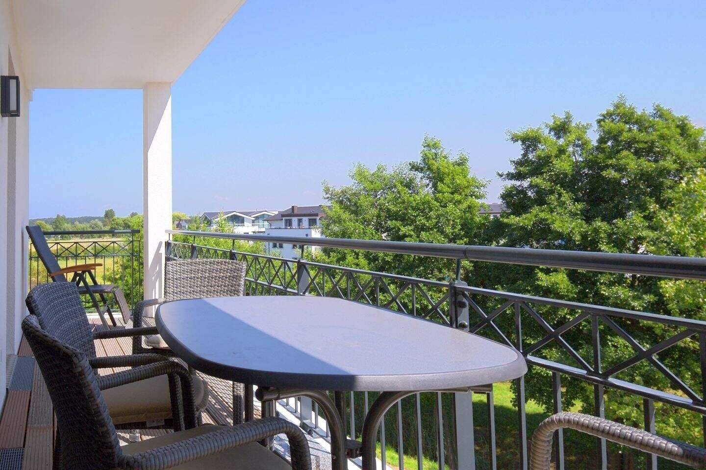 Genießen Sie den von beiden Zimmern begehbaren sonnigen großen Süd-Balkon mit seitlichem Blick auf die Ostsee und auf die neben dem Hotel gelegene gepflegte Parkanlage.
