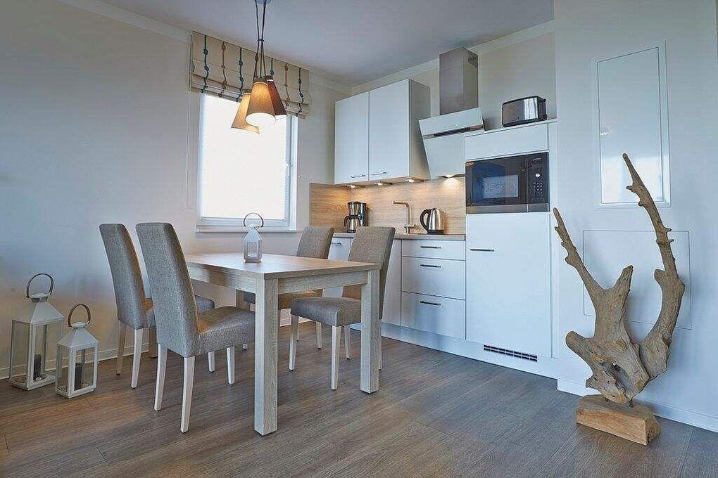 Die offene Küche mit integriertem Essbereich besitzt einen Geschirrspüler, Gefrierfach, Toaster, Kaffeemaschine, Mikrowelle, 2-Platten-Ceranfeld und Wasserkocher. Am großzügigen Esstisch können Sie gemütlich sitzen, um in den eigenen vier Urlaubswänden ihr individuelles Dinner zu genießen oder einfach um ganz in Familie lustige Gesellschaftsspiele zu spielen.
