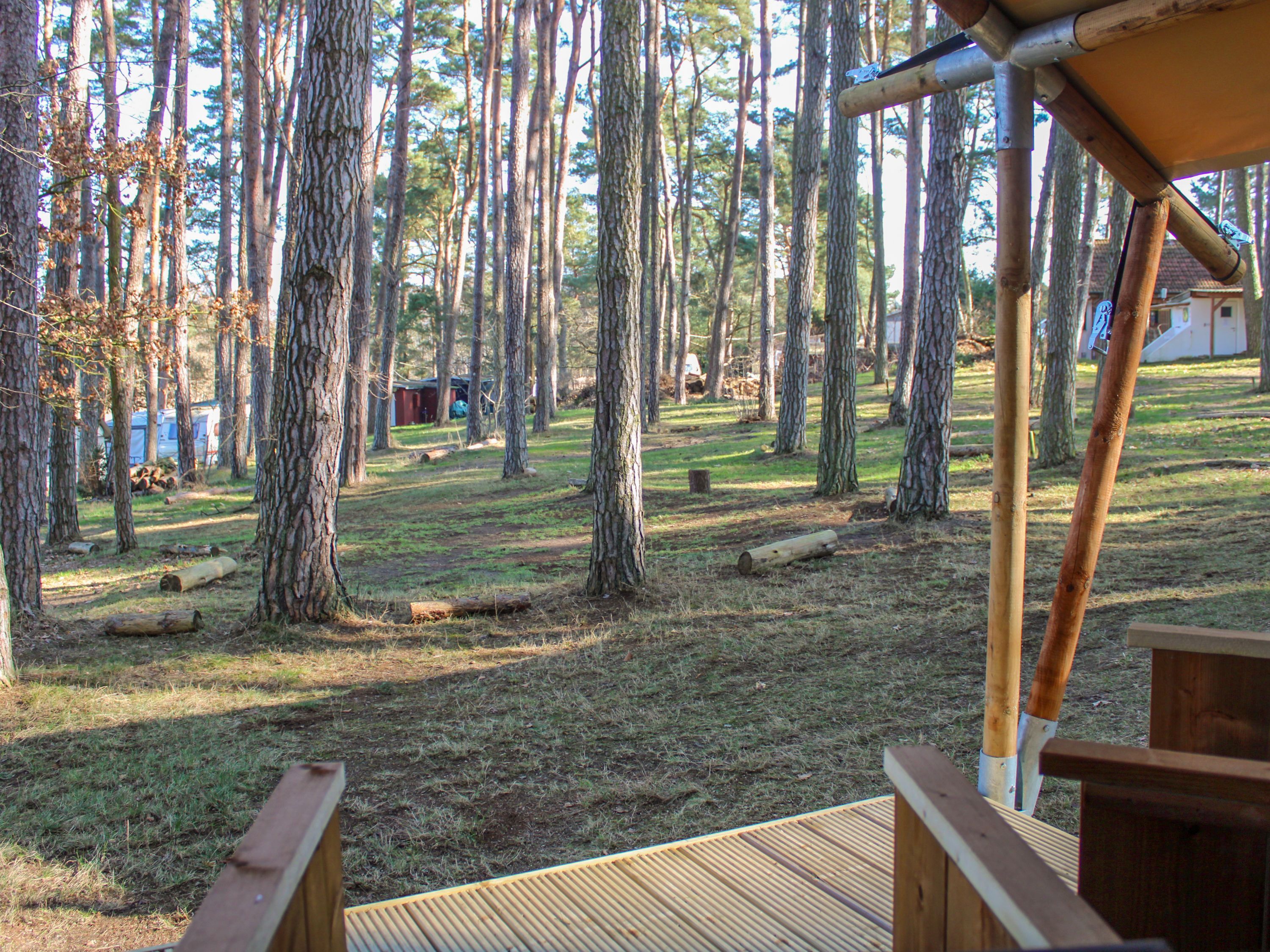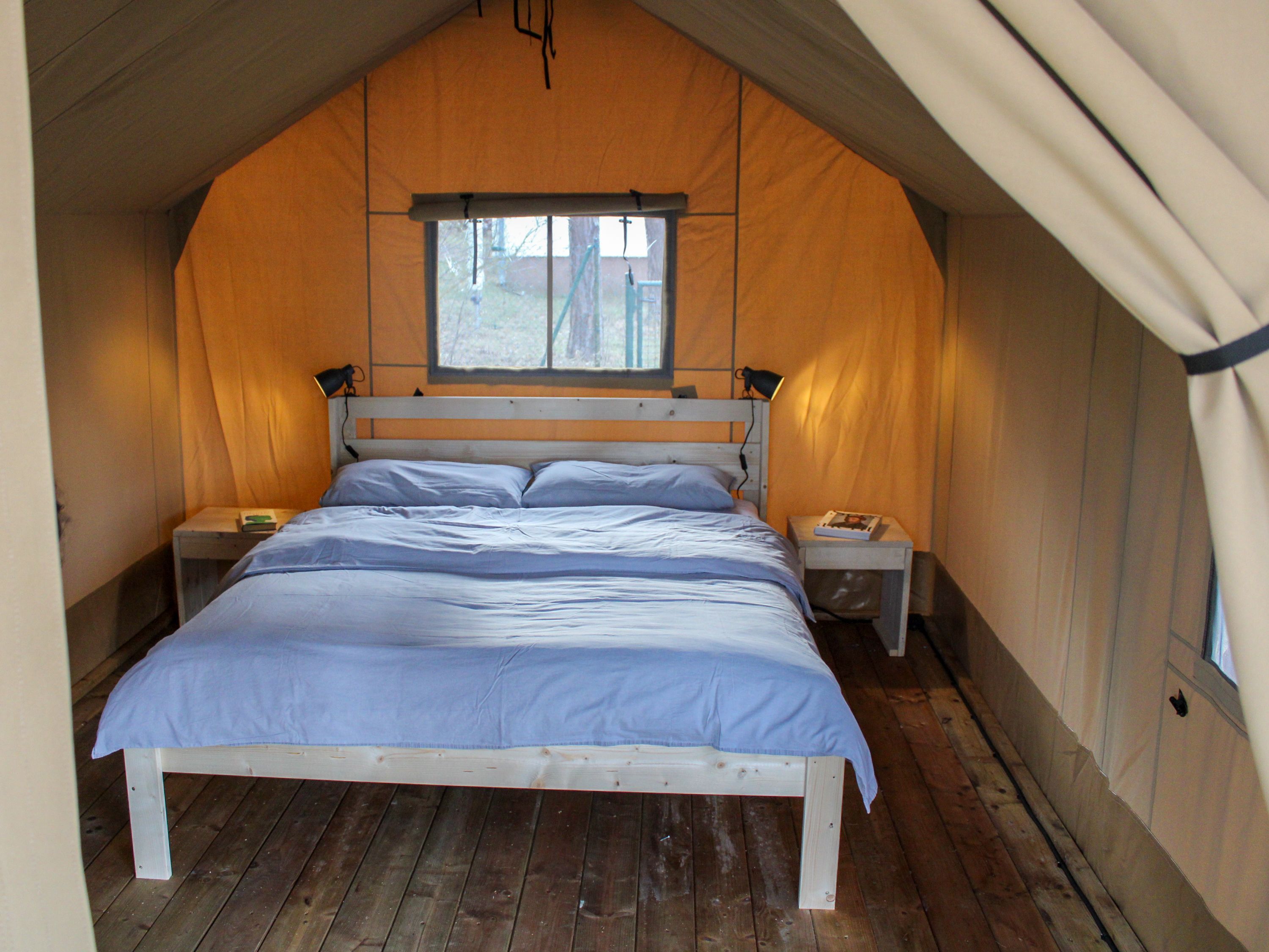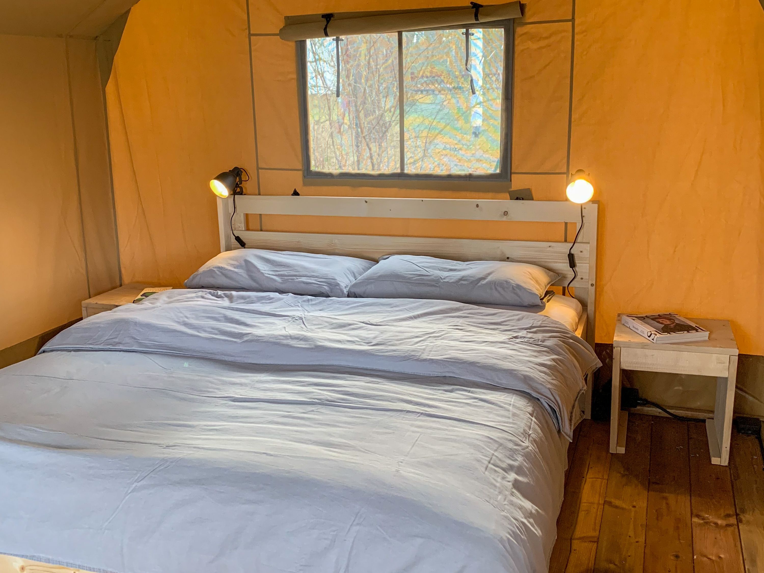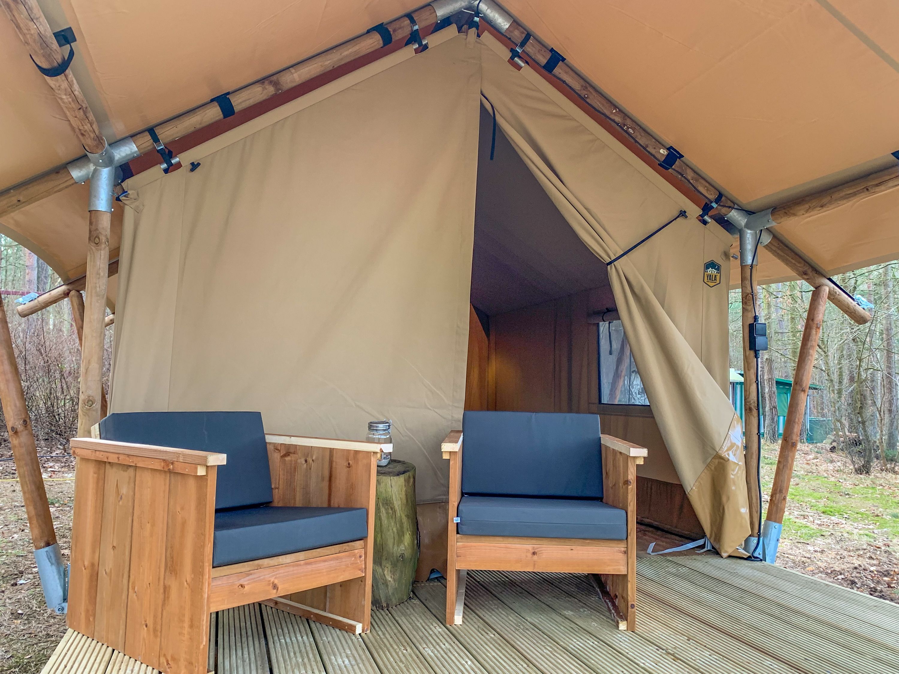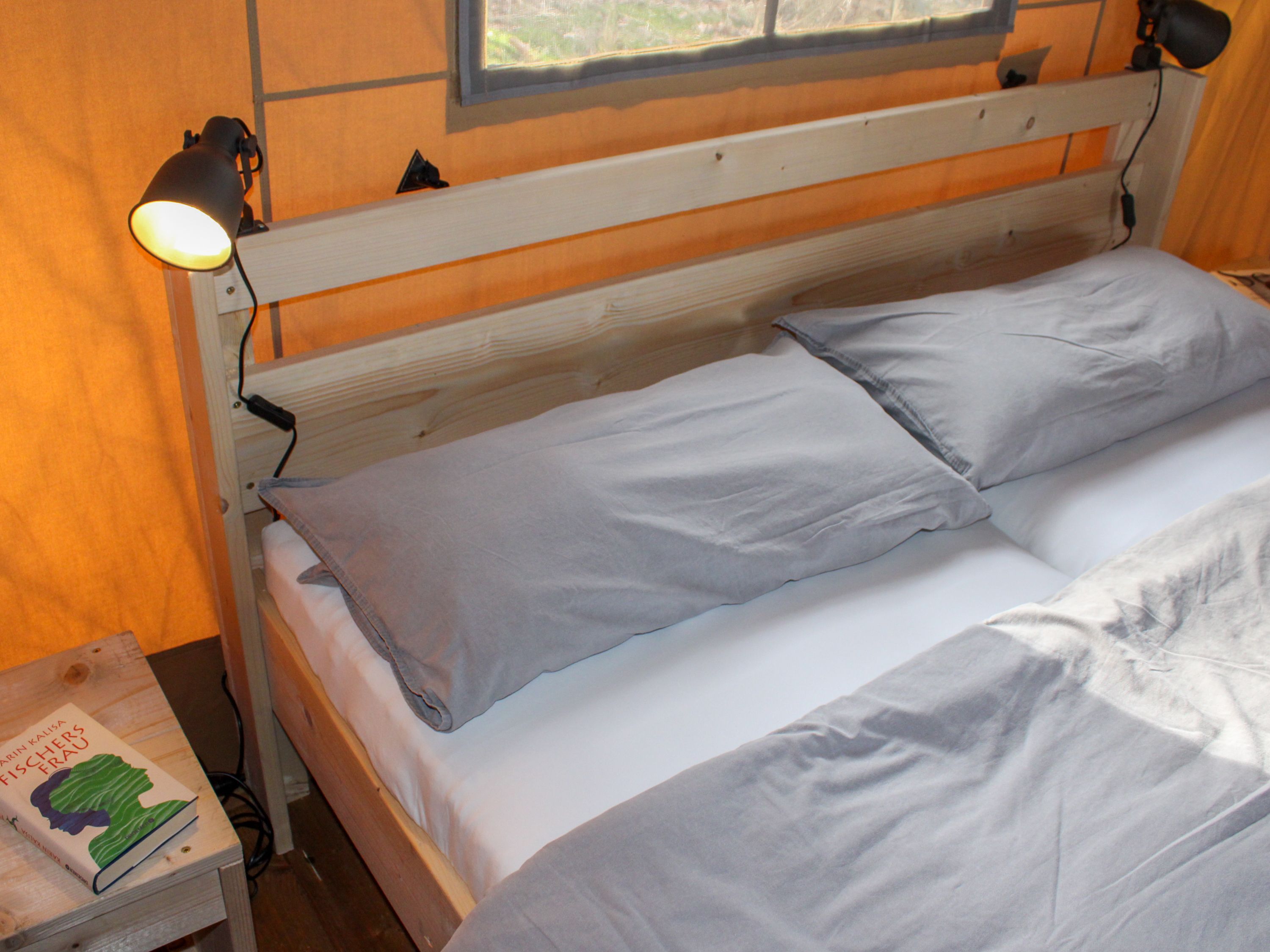Die Zelt-Lodges sind genau das Richtige für alle, die das Campinggefühl lieben, aber nicht auf eine gemütliche Unterkunft verzichten möchten. In einem ruhigen Teil des Campingplatzes gelegen, bieten die rund 12 m² großen Lodges Platz für 2 Personen und eine wunderbar entspannte Atmosphäre mitten in der Natur. Innen wartet ein gemütliches Doppelbett (160x200) auf dich und für Familien mit Kindern stellen wir auf Anfrage gern ein Feldbett dazu. Eine kleine Kaffeemaschine und ein Wasserkocher sorgen schon morgens für den ersten Wohlfühlmoment im Zelt. Draußen lädt dich die überdachte Terrasse mit zwei Liegestühlen und einem Picknicktisch zum Entspannen ein. Die Sanitärgebäude mit Waschraum, Dusche und WC sind ganz in der Nähe und nur ein paar Schritte entfernt. Gekocht wird in der gut ausgestatteten Gemeinschaftsküche, in der dir Herd, Mikrowelle, Wasserkocher, Töpfe, Pfannen, Geschirr und ein großer Kühlschrank zur Verfügung stehen. Außerdem gibt es eine Feuerstelle und einen Grillplatz, wo du den Abend ganz gemütlich ausklingen lassen kannst. Und wenn du Lust auf einen kleinen Schnack hast oder ein paar Tipps für Ausflüge brauchst komm einfach an der Rezeption im Bauwagen vorbei.