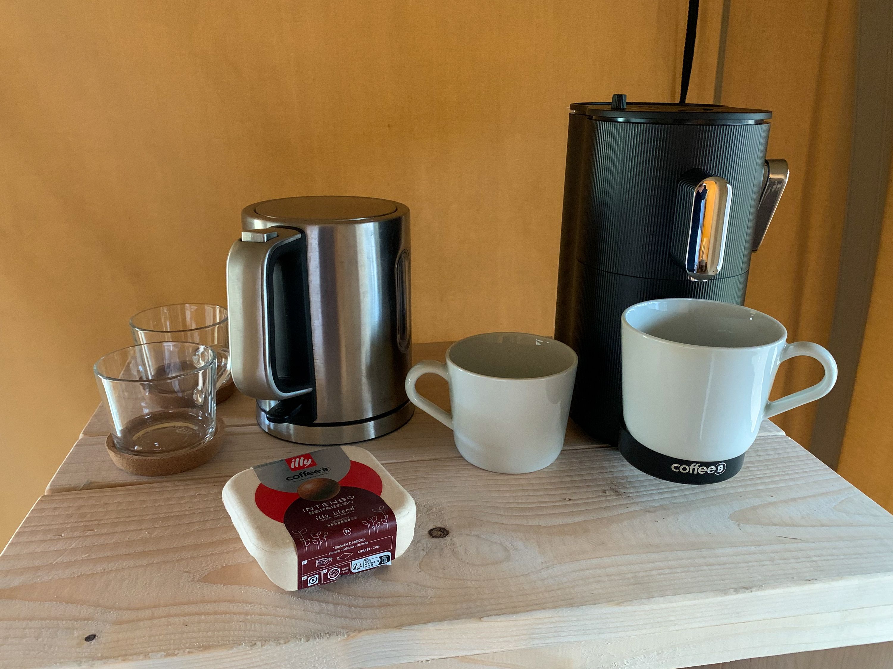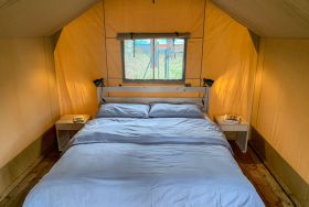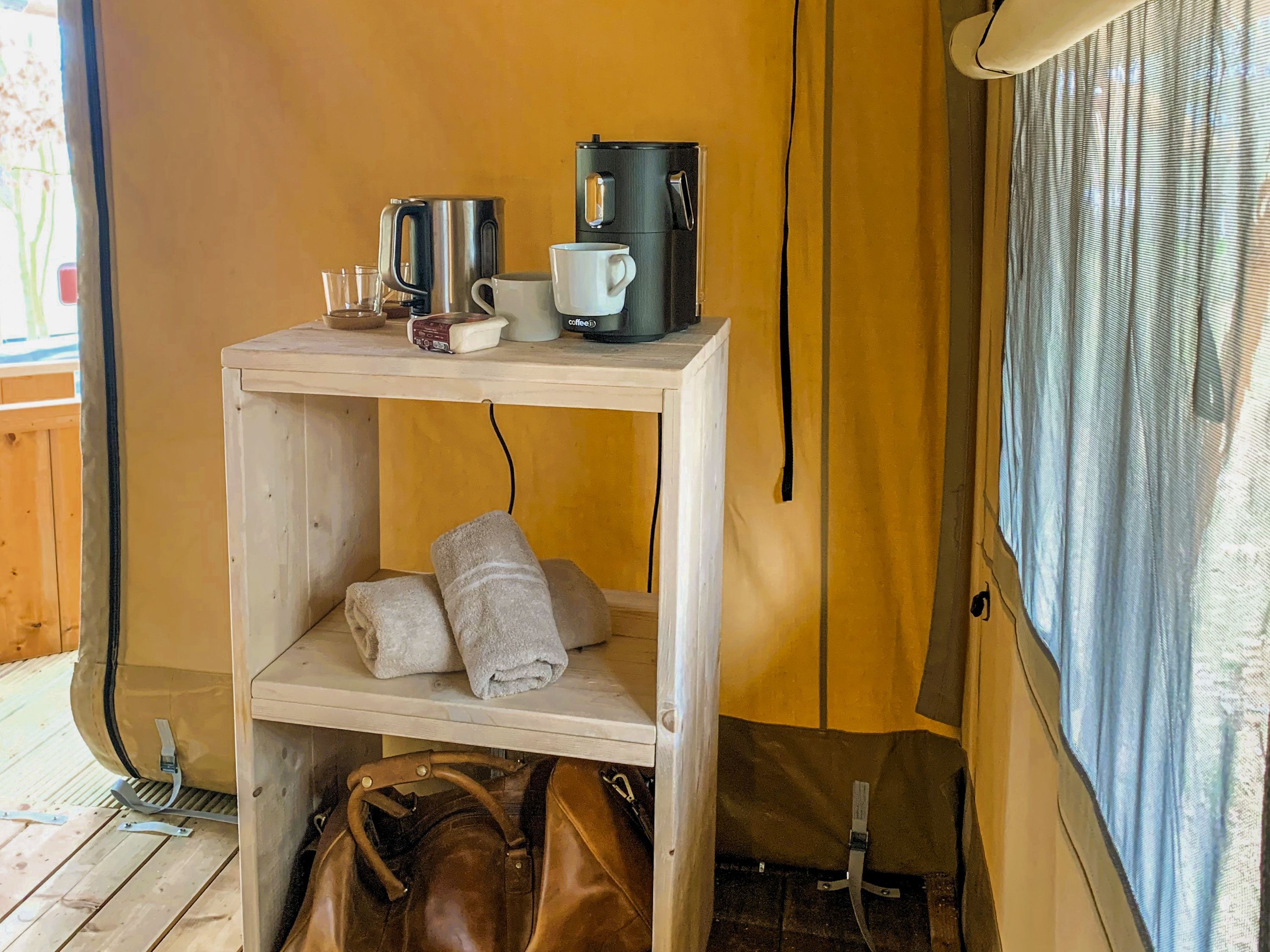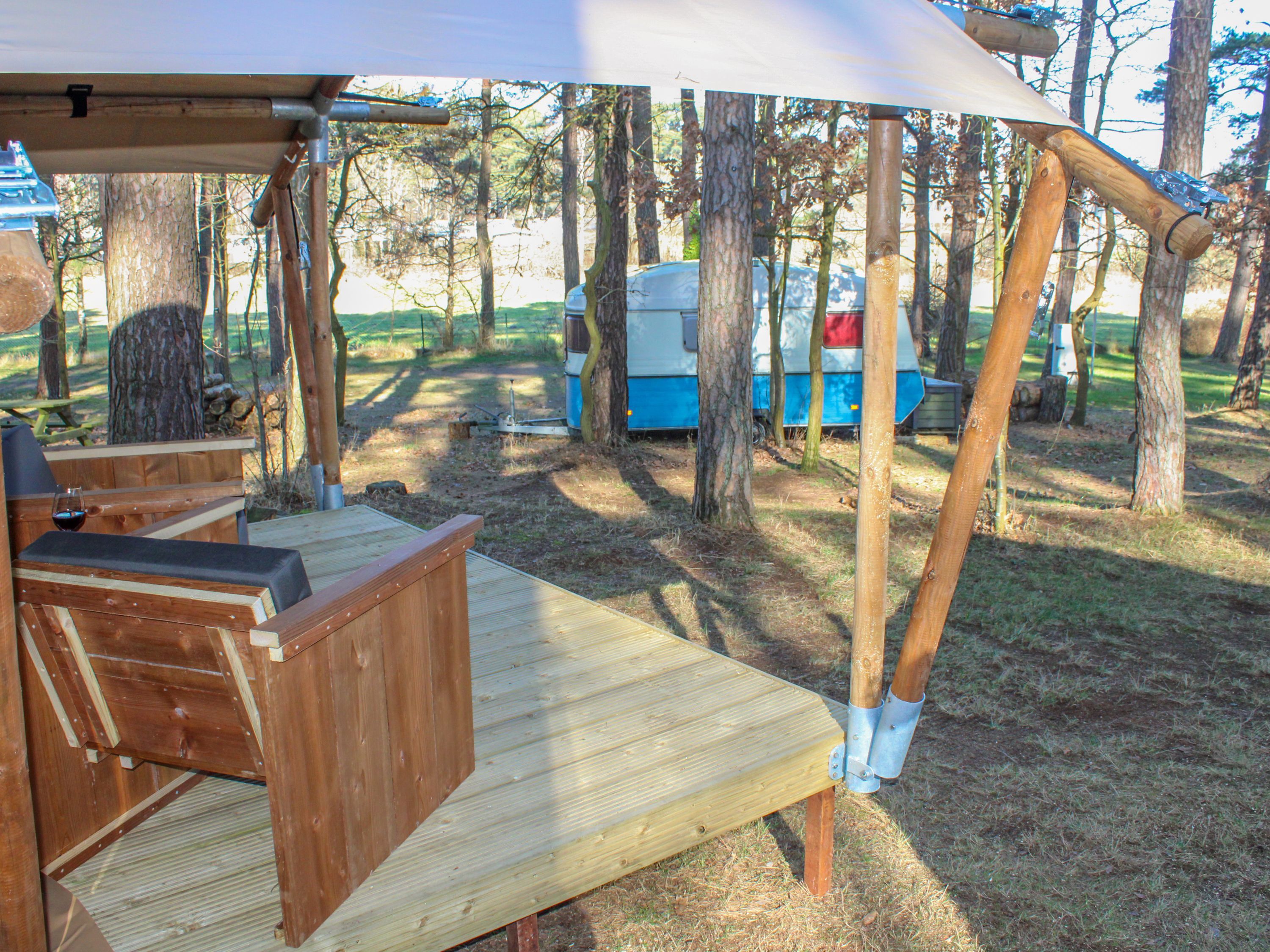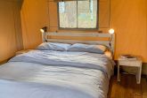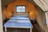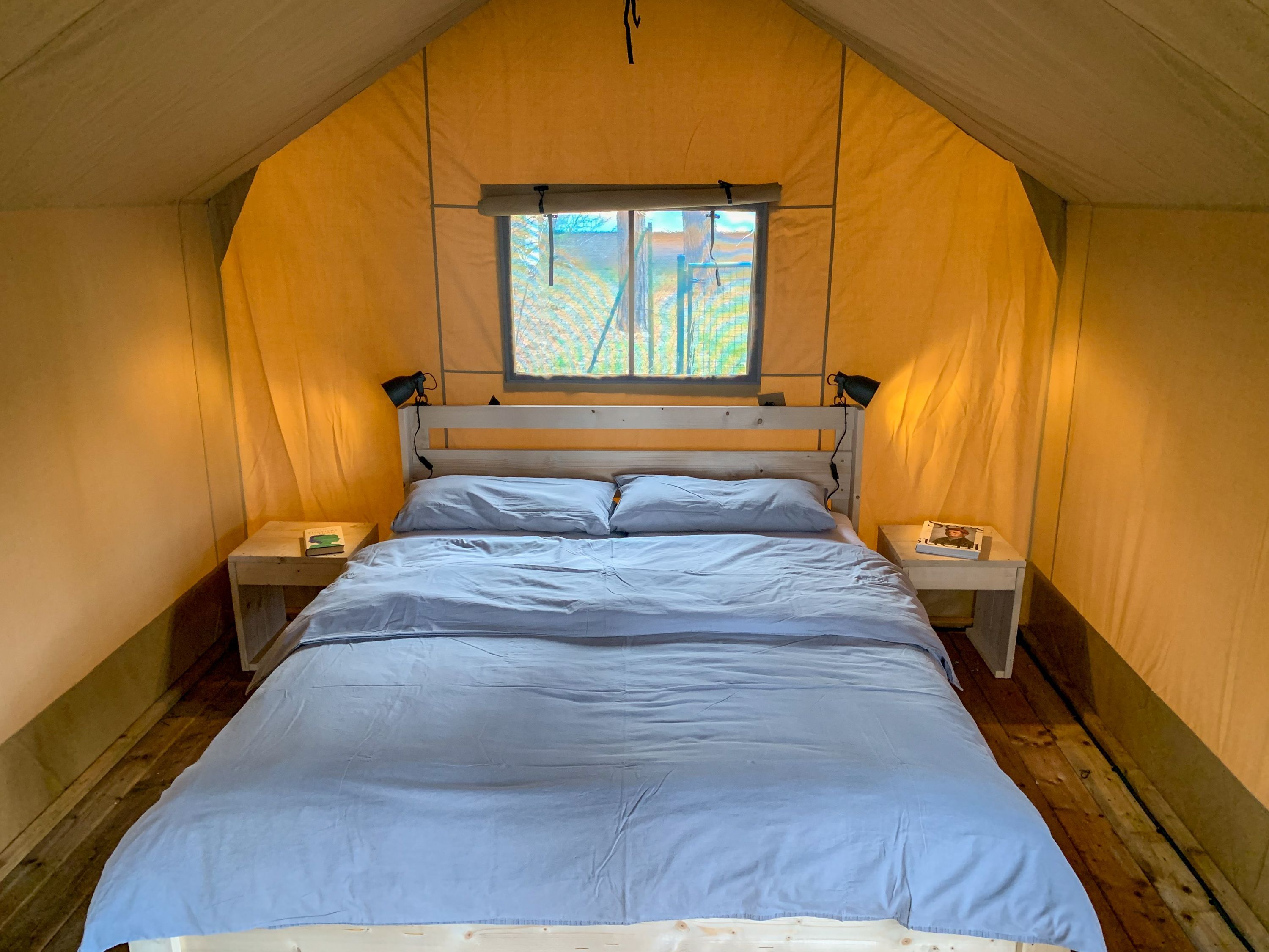Die Zelt-Lodges sind genau das Richtige für alle, die das Campinggefühl lieben, aber nicht auf eine gemütliche Unterkunft verzichten möchten. In einem ruhigen Teil des Campingplatzes gelegen, bieten die rund 12 m² großen Lodges Platz für 2 Personen und eine wunderbar entspannte Atmosphäre mitten in der Natur. Innen wartet ein gemütliches Doppelbett (160x200) auf dich und für Familien mit Kindern stellen wir auf Anfrage gern ein Feldbett dazu. Eine kleine Kaffeemaschine und ein Wasserkocher sorgen schon morgens für den ersten Wohlfühlmoment im Zelt. Draußen lädt dich die überdachte Terrasse mit zwei Liegestühlen und einem Picknicktisch zum Entspannen ein. Die Sanitärgebäude mit Waschraum, Dusche und WC sind ganz in der Nähe und nur ein paar Schritte entfernt. Gekocht wird in der gut ausgestatteten Gemeinschaftsküche, in der dir Herd, Mikrowelle, Wasserkocher, Töpfe, Pfannen, Geschirr und ein großer Kühlschrank zur Verfügung stehen. Außerdem gibt es eine Feuerstelle und einen Grillplatz, wo du den Abend ganz gemütlich ausklingen lassen kannst. Und wenn du Lust auf einen kleinen Schnack hast oder ein paar Tipps für Ausflüge brauchst komm einfach an der Rezeption im Bauwagen vorbei.