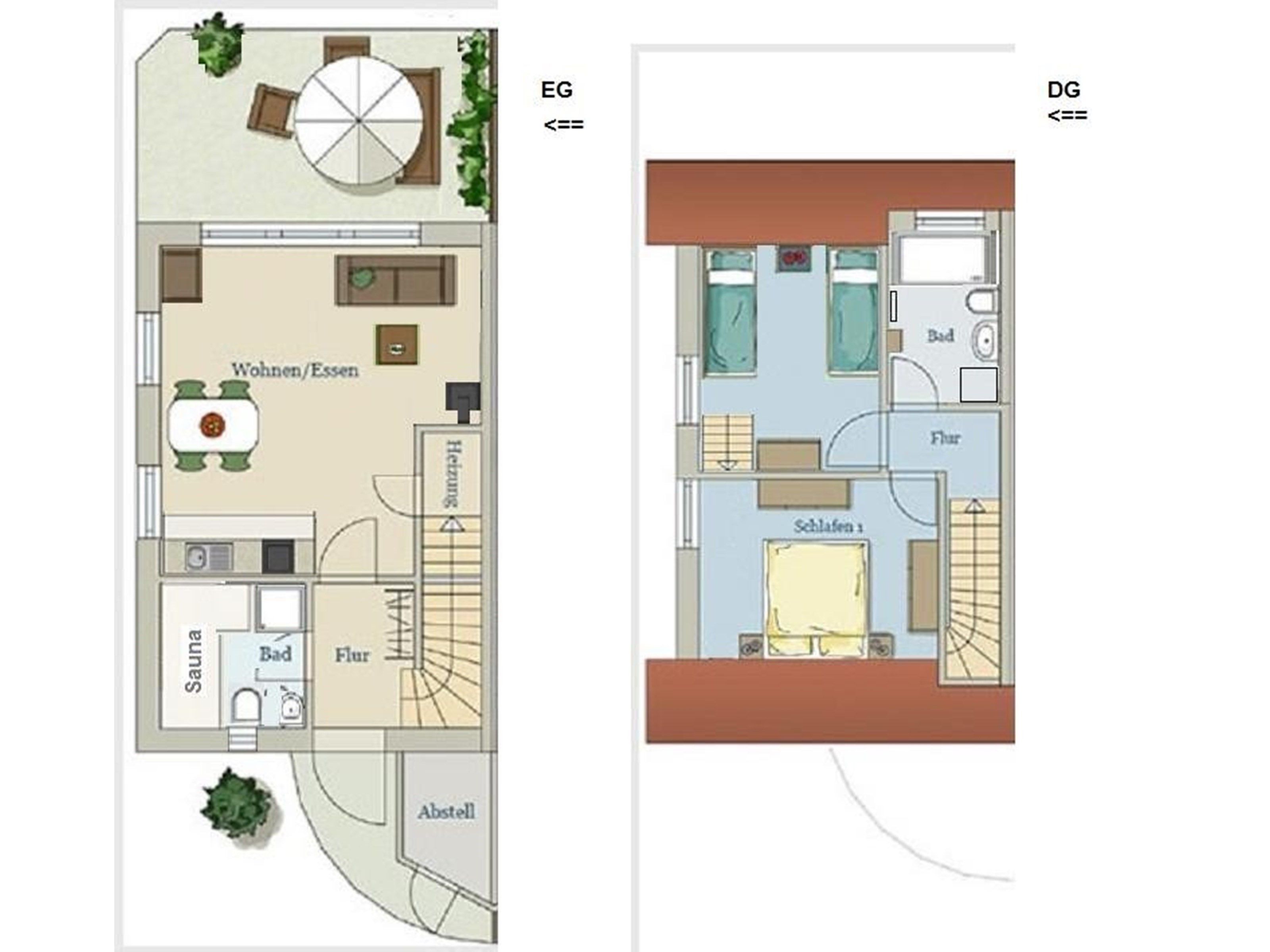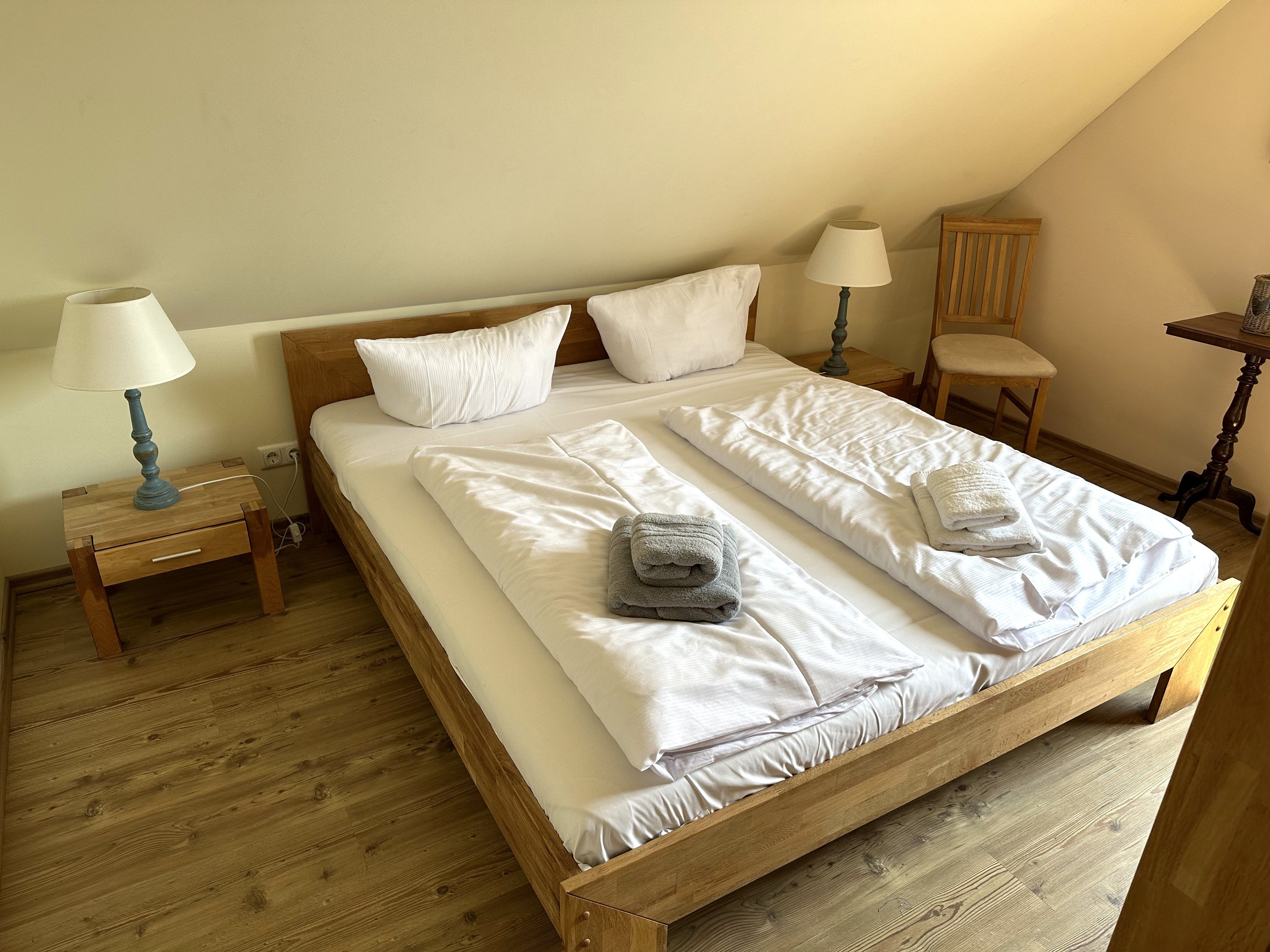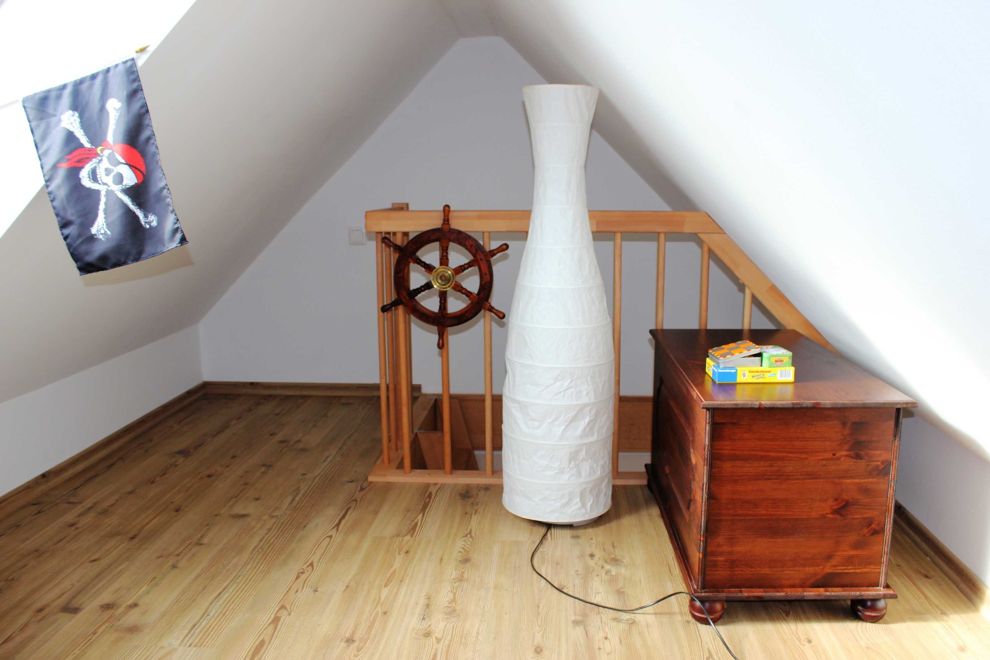 Im Obergeschoss finden Sie zwei separate Schlafzimmer (eins mit Doppelbett und zusätzlichem Flat-TV, eins mit zwei Einzelbetten). Für Kinder kann der Spitzboden zusätzlich noch als Schlafgelegenheit genutzt werden. Hierzu stehen zwei Sessel, die zu Betten ausgeklappt werden können zur Verfügung. Das zweite Badezimmer im OG ist mit Badewanne/WC und Fön ausgestattet.