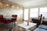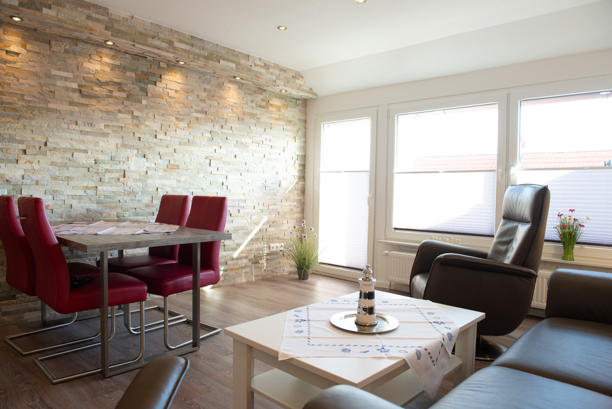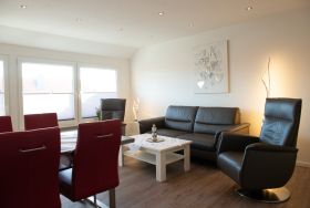 Im Wohn - Essbereich mit Tisch und 4 Stühlen sowie einer gemütlichen Couch, zwei Relax-Sessel und Sat/TV mit Flachbildschirm können Sie entspannt relaxen und der Balkon lädt zum Sonnenbaden ein. Die Küche ist getrennt vom Wohnbereich und hält alle Kochutensilien für Sie bereit.