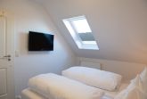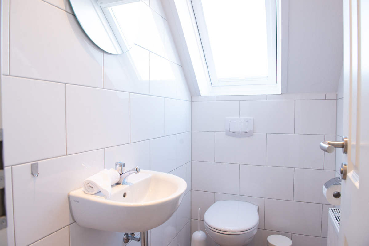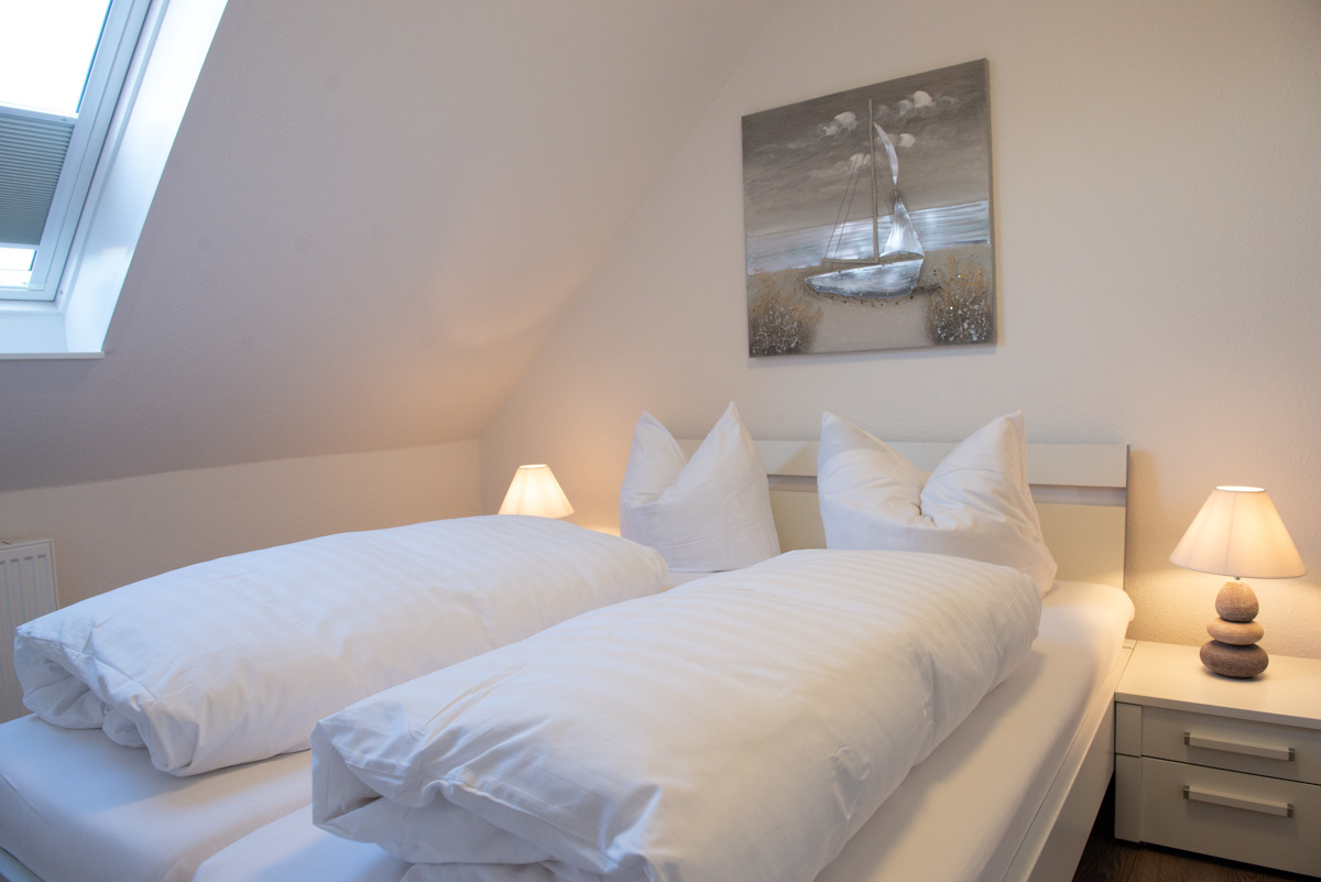 Die Ferienwohnung Santa Maria liegt im 2. OG und verfügt über zwei getrennte Schlafzimmer, die mit Veluxfenstern + Verdunklungs - Plissees ausgestattet sind. Das moderne Bad ist mit einem Veluxfenster, einer bodenebenen Dusche und einem Handtuchhalter - Heizungskörper ausgestattet. Das WC ist separat.