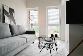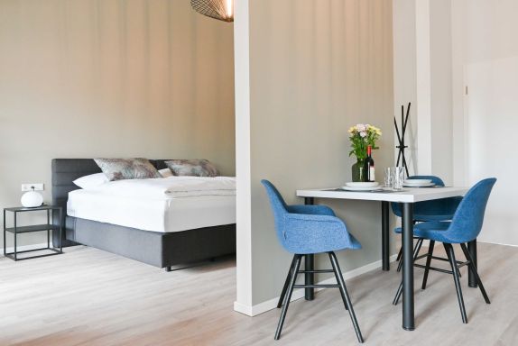 Das stilvoll eingerichtetet Apartment befinet sich im 2. OG des Gebäudes. Die Wohnung verfügt über einen offenen Wohn,-Schlaf- und Essbereich. Sie gelangen durch den offenen Wohnbereich zum Balkon. DIe Küche ist vollausgestattet mit Wasserkocher, Kaffeemaschine, Toaster, Kühlschrank, Backofen und Ceranfeld. Ebenso befindet sich in der Wohnung ein barrierefreies Bad mit Dusche und WC, ein Haartrockner ist zudem vorhanden. Im Hauswirtschaftsraum befindet sich eine Waschmaschine mit Trockner. Die Wohnung erreichen Sie über den Treppenaufgang oder den Fahrstuhl.