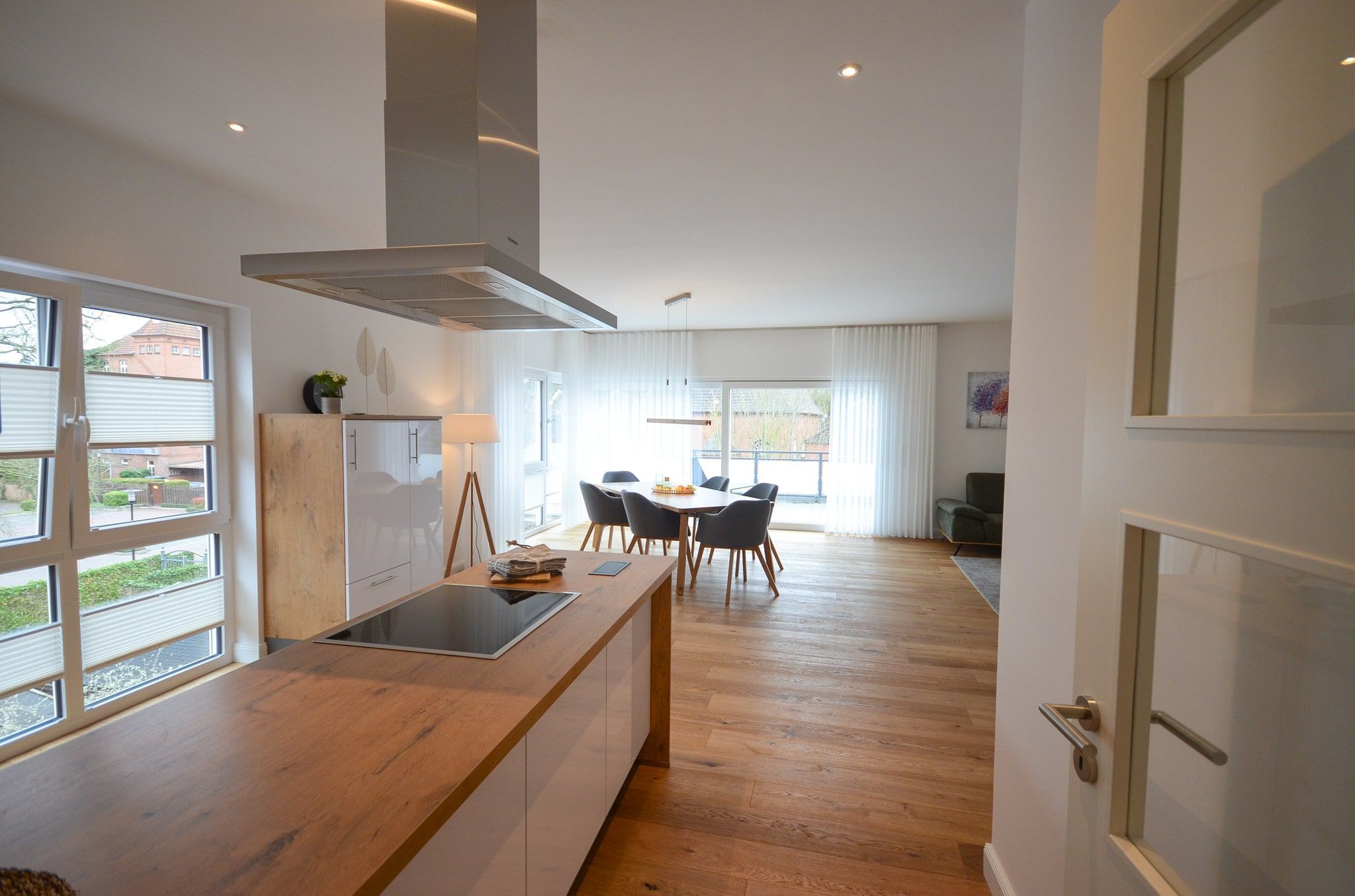 Die Küche in U-Form mit dem fließenden Übergang zum Wohnzimmer hat alles, was Ihren Wünschen und Vorstellungen von einer idealen Küche entspricht. Hochwertige Geräte, ein Induktionskochfeld mit Inselhaube und eine vollständige Ausstattung zum Kochen – es fehlt an nichts.