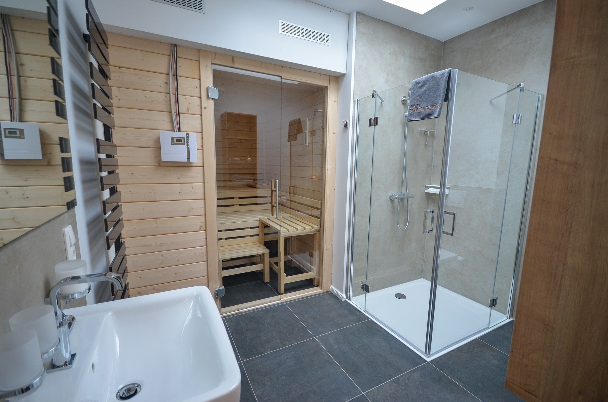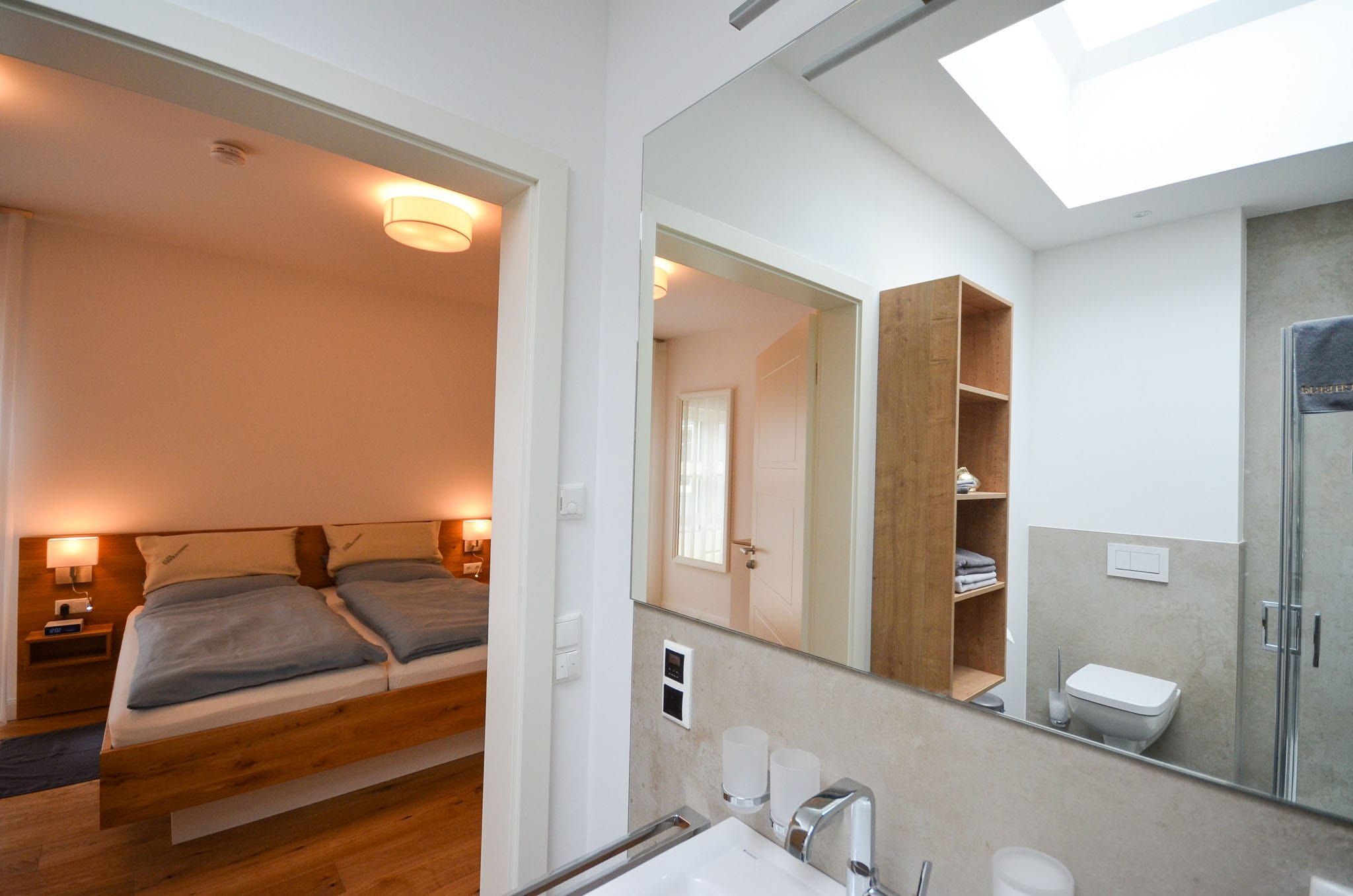 Das Tageslichtbad grenzt en Suite an das Schlafzimmer. Es hat ein großes, elektrisch bedienbares Oberlicht, eine ebenerdige, verglaste Dusche (120 x 100 cm) mit Regendusche und Handbrause, einen Waschtisch, einen Handtuchheizkörper und ein WC, ausreichend Ablageflächen sowie ein Einbauradio.  Aber das ist noch nicht alles, wir bieten Ihnen mit diesem Apartment mit einer Holzsauna Ihre eigene kleine Wellnessoase.