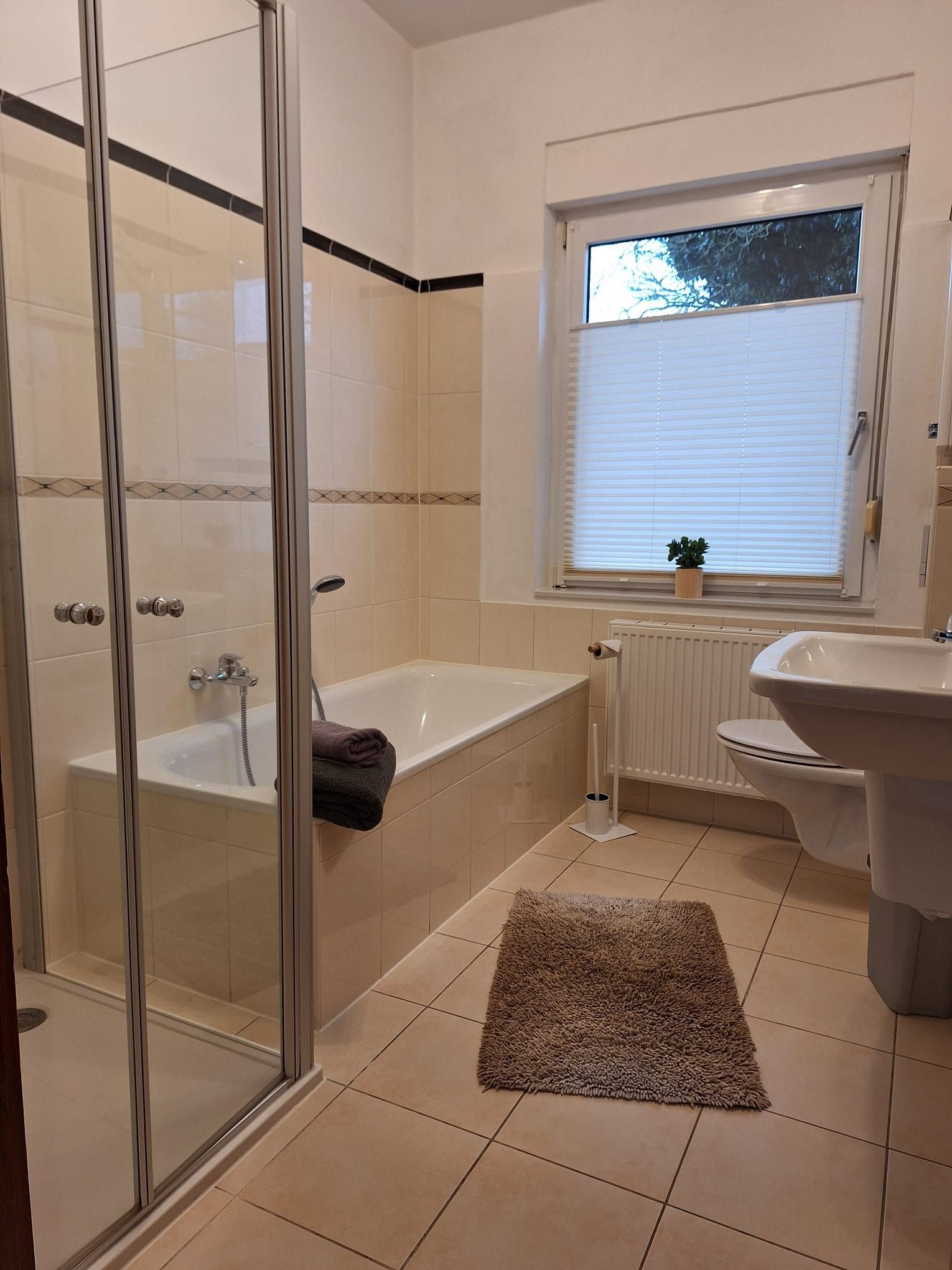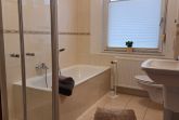 Separater Eingang, Wohnzimmer, TV, Radio, komplett eingerichtete Küche mit Essbereich und Mikrowelle, 2 Doppelschlafzimmer, DU/WC/Wanne (begehbare Dusche) und Terrasse mit Gartenmöbeln und Grill.