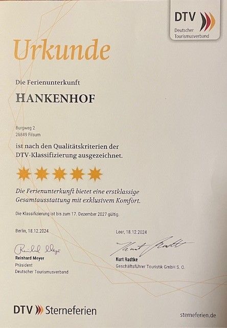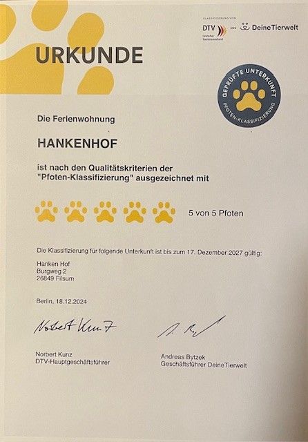 Zudem ist die Ferienwohnung HANKENHOF mit 5 Sternen in der Pfoten-Klassifizierung vom DTV ausgezeichnet worden.