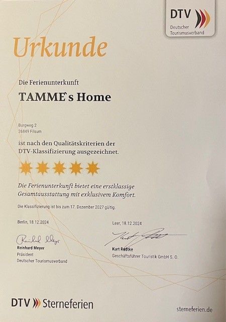 Die Ferienwohnung ist mit 5 Sternen vom DTV ausgezeichnet worden.