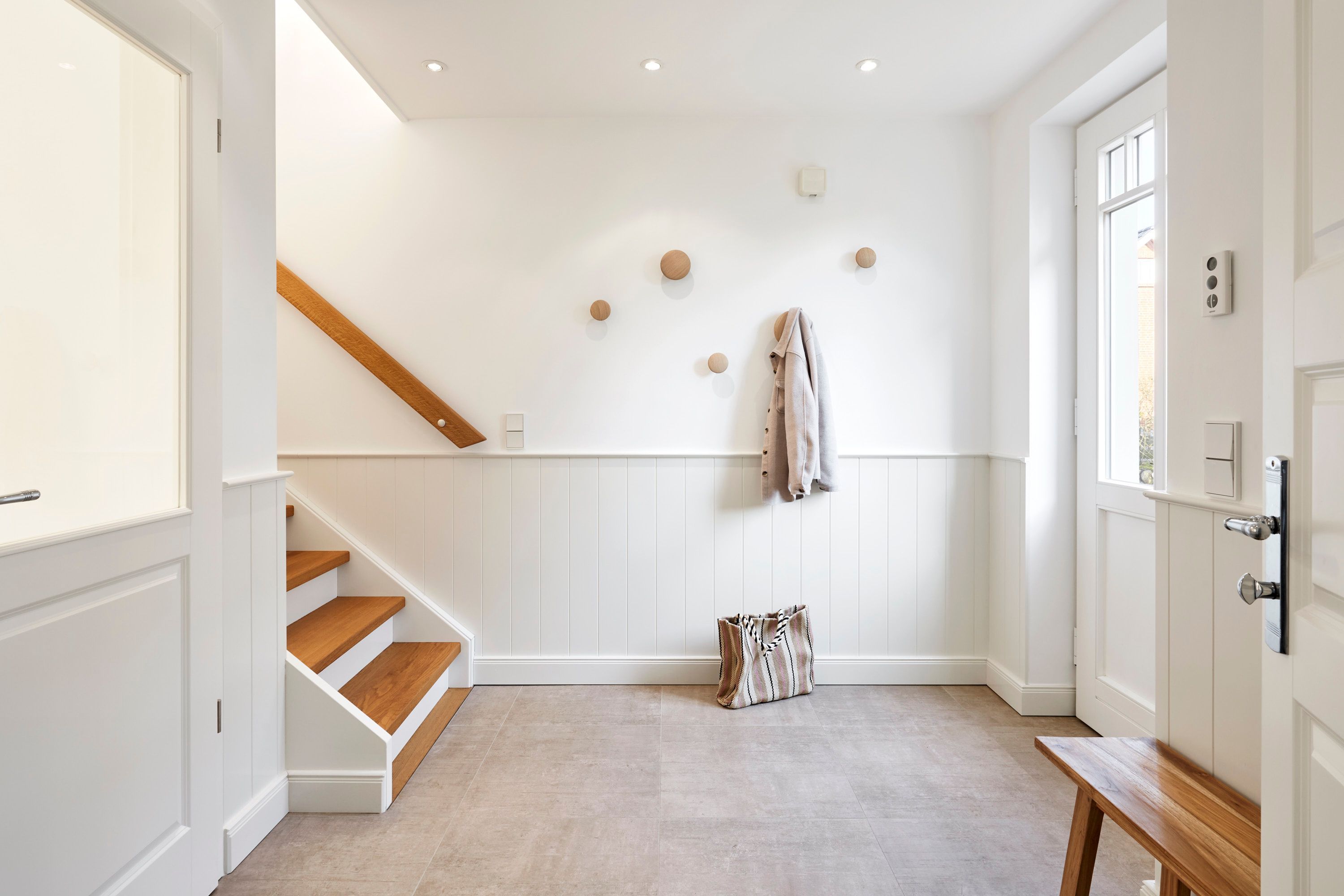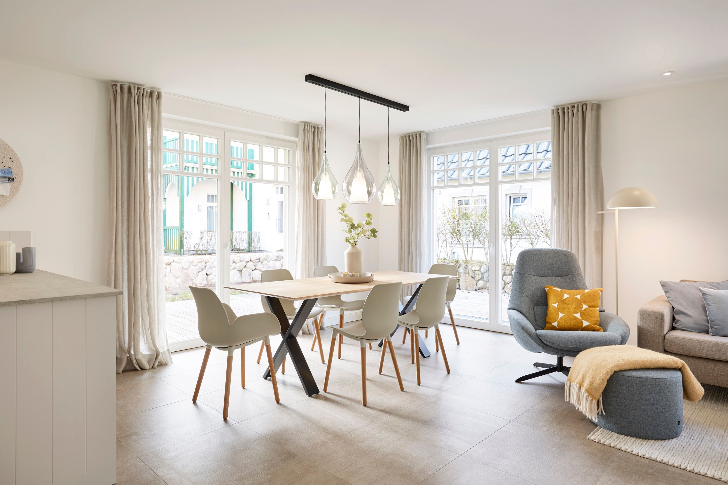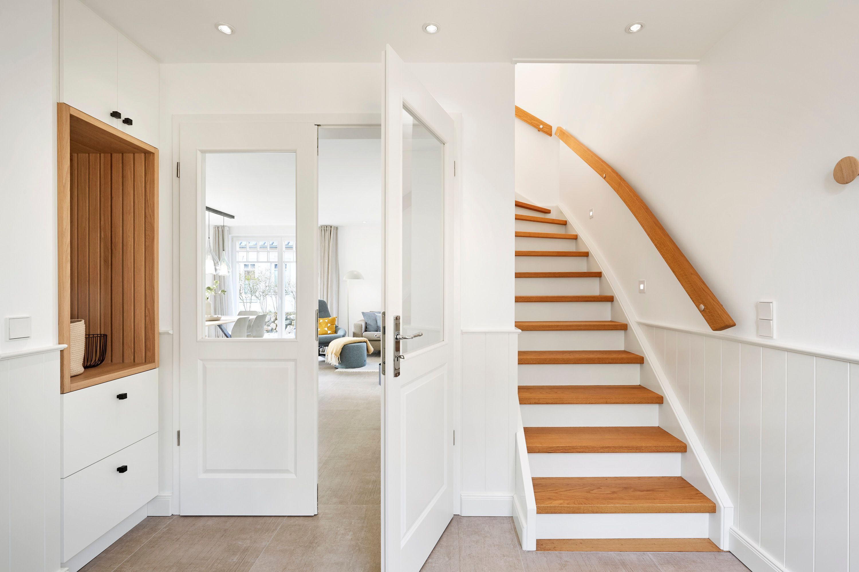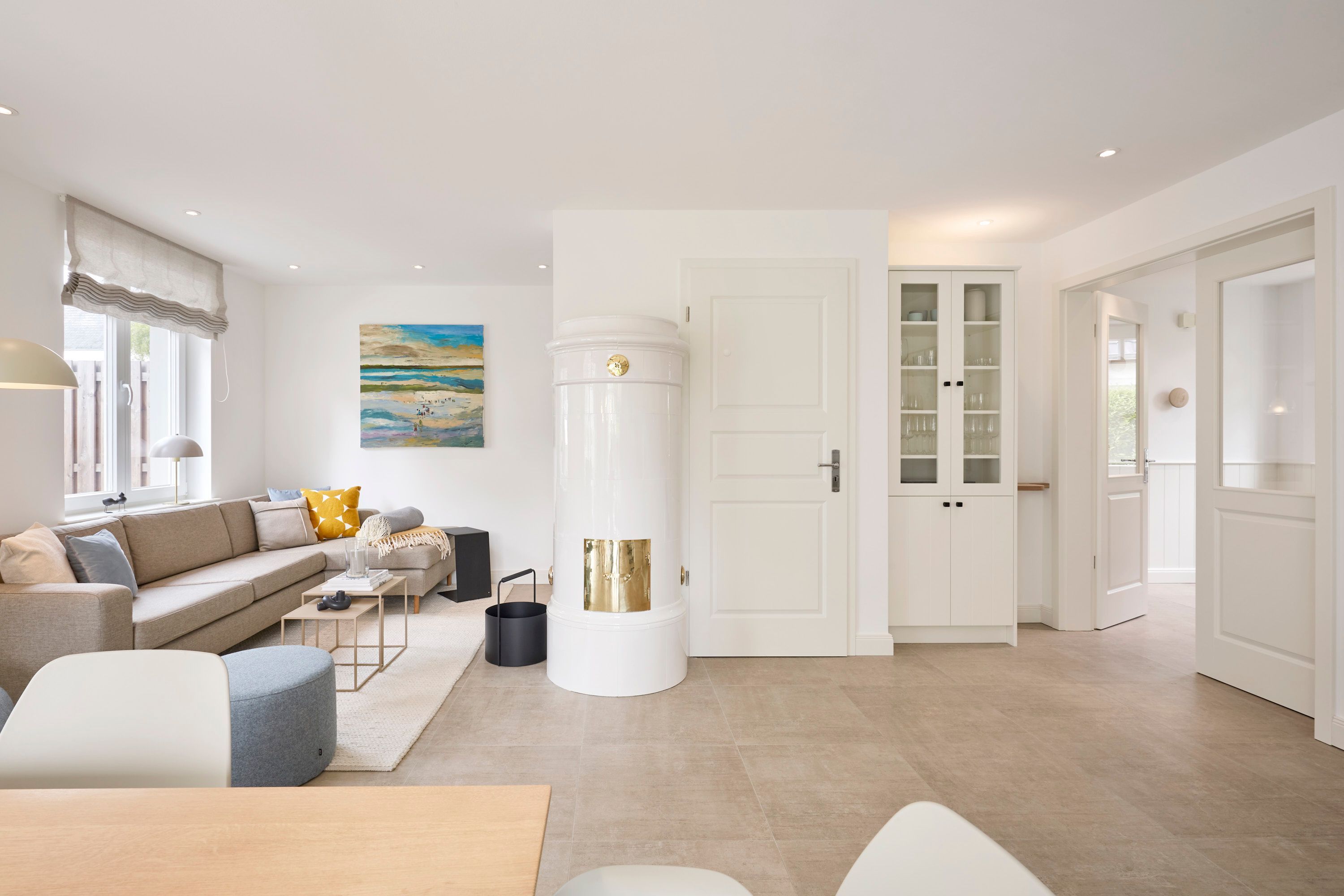 Beim Betreten empfängt Sie ein heller uns geräumiger Windfang vom dem aus Sie direkt auch in das Gäste WC im Erdgeschoss gelangen. Durch eine Glastür betreten Sie den Wohn- Essbereich sowie die offene Küche. Alles ist in sanften Farben mit moderner Gemütlichkeit und Design Highlights sehr stimmig eingerichtet. Ein Mylin Kamin im Wohnbereich bereit im Herbst eine wohlige Atmosphäre.